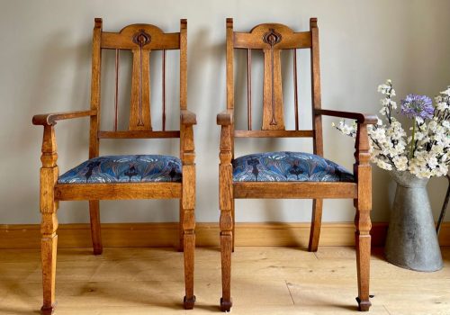 A truly stunning matching pair of Art Nouveau open armchairs in oak. They date form around 1890-1910 and are hand made from superb quality English oak. The carving is exquisite and very typical of the Art Nouveau period in the UK. The proportions are very generous/ oversized making for a stunning statement piece in a hall way, bedroom, landing/ mezzanine etc. We reupholstered the seats in a fabric from Liberty of London. It is from their art range, finished in a soft velvet to touch and completely innkeeping with the Art Nouveau style. We adore these chairs! From the colour and quality of oak, the beautiful hand carvings, the over sized proportions – and that Liberty fabric………….!