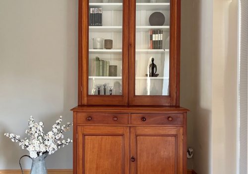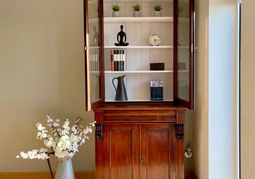 A beautiful late 19th Century Victorian glazed dresser / bookcase in original mahogany finish. It dates from around 1890 to 1900 and has completely original cabinetry, glass, and height adjustable shelves. The dresser is in very good original condition for its age with all joints solid and all four doors opening freely on their original hinges. We fully cleaned and oiled the original exterior finish then repainted the top internal with Farrow & Ball Wevet colour paint. This has given the piece the perfect mix of antique, rustic and contemporary. It is very stylish, subtle in design and very flexible in the colours – to match a vast array of room palletes.