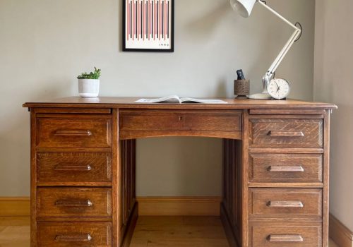 A beautiful double pedestal ‘teachers’ style desk in a perfectly aged honey oak colour. It dates from the early to late 1930’s and is in completely original condition but fully cleaned and gently restored by us. It has six very clean and free running drawers – three of which lock with their original locks and one key (present). The size is fantastic. Not too large to be able to accommodate at home but offering lots of storage and a really nicely sized work surface for home use. The bottom right hand drawer is a double height deep filing type drawer for extra storage.