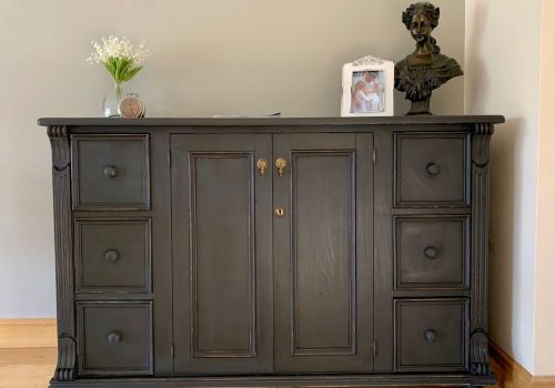 We fully refinished the sideboard in Farrow & Ball Off Black, distressed to highlight its character and design, then finished with Annie Sloan dark wax for a protective finish.