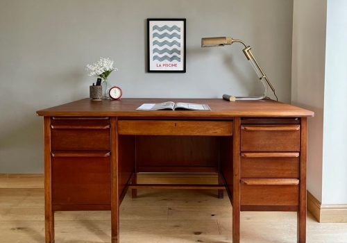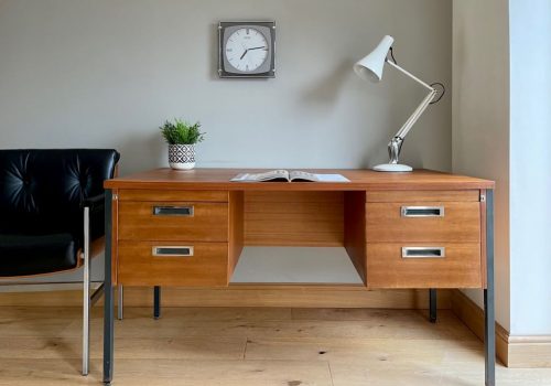 A very stylish mid century teacher’s desk in beautiful oak. It dates from around the mid to late 1960’s and is in beautiful condition, fully cleaned and gently restored by us. This desk came to us from a retired teacher in Leicestershire. She purchased the desk from the school where she worked to have it at home. It is presented in a beautifully aged colour and patina with a really nicely sized work surface for home use. The drawers run freely and have been cleaned and sanded back internally. The bottom right hand drawer is a double height filing drawer. There are two pull out shelves to the top of both pedestals – one just a shelf, the other containing the original plastic stationery tray.