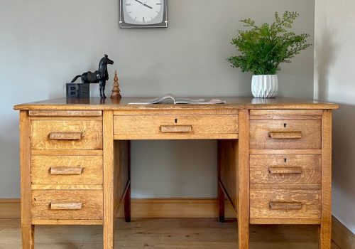 A superb large double pedestal desk dating to the late 1920’s to early 1930’s. It is constructed from beautifully aged oak solid throughout. We had to refurbish the top due to sun fading and wear from use. It is now cleaned, refurbished and ready to be treasured. The desk offers lots of storage space with six drawers in total. The bottom drawer of the right hand pedestal is a double height filing type drawer. It is presented in a beautiful aged rich oak with all handles totally original and free from splits, cracks or missing areas – as is so often the case with desks of this age. It is solid, heavyweight and offers a superb work surface for regular use. A piece to be used, admired and treasured.