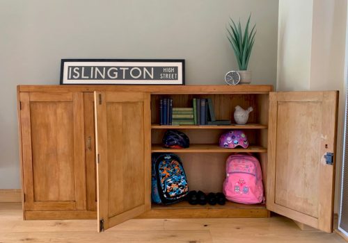 An original school cabinet saved form a school in Ilkeston, Derbyshire. It dates from around the early 1960’s in is made from solid beech throughout, giving it a solid feel and heavy weight. It was in a sorry state when we bought it so we stripped it back, oiled it, sympathetically colour matched the wood colour, then refinished in a satin sheen finish top coat. It has also had a new back and been fully sanded and cleaned inside. We left the original hand written shelf labels on because we love how they reflect its heritage and original use.