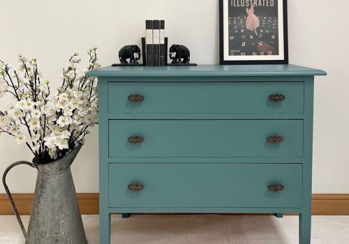 This is an original antique chest of drawers originally produced circa early 1900’s. It came to us in a tired state of dull dark brown and in need of restoration. We fully stripped the whole piece and refinished it in Farrow & Ball Hague Blue Estate Emulsion for a contemporary colour pop and very appealing matt finish. A clear coat of Annie Sloan chalk paint wax has also been applied, to seal against water and spills. The chest has some nice weight to it, reflecting some quality of handmade construction. Not a lightweight flimsy piece. We love the size and clean lines, together with the gorgeous original drop handles for detail.