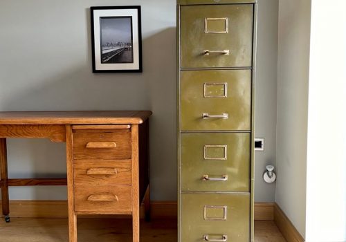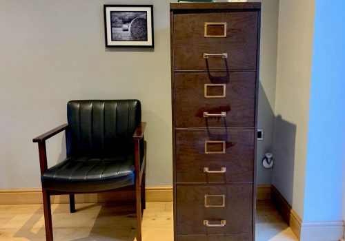 A great set of original mid century (c 1940-50) steel filing drawers by Art Metal (London, SW1). Most of these cabinets are by Roneo. Art Metal cabinets are much harder to find; especially in this condition with this finish. This cabinet is unusual in that it is a green filing cabinet underneath but was finished (from new) in a paint effect to look like wood grain. Great colour and superb original condition, with perfectly aged original brass ware. They are very rare to find in unscratched condition. This one survived so well as it came directly from a solicitor’s office in Warwickshire, where it spent its whole life in an office, rather than a warehouse or engineering firm. They clearly looked after it well!