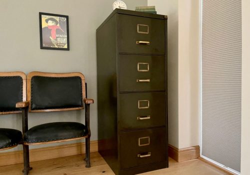 A very clean and well preserved set of original mid century steel filing drawers. They come in the best aged green colour. Produced by Howdens in the 1960’s the drawers are in a superb colour and condition, with all original handles and label holders. The condition is exceptional for the age of the cabinet with no dents, major scratches, rust etc; which are all very common on these old filing cabinets. It is the perfect size for home or office with all drawers ready for new A4 suspension files that fit on the drawer sides as sliding rails. The cabinet and drawers have all been fully cleaned and the runners re-oiled. Superb condition for its age with plenty of industrial design and character. Industrial style and practicality all rolled in to one.