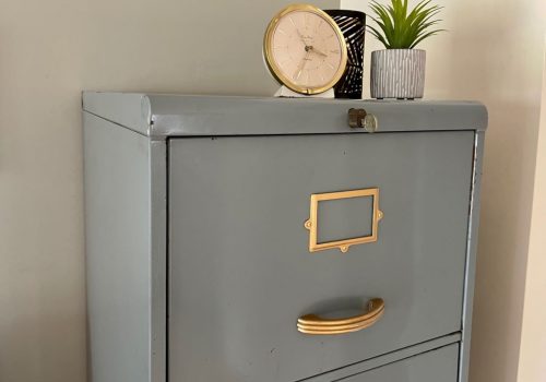 A unusual set of original mid century steel filing drawers in a very attractive grey colour with slight blue undertones. We have not seen this colour before , nor the gold handles and label holders. The colour combination really works and will blend very well with a vast range of colour schemes. All four drawers have their original side rails for suspension file hanging. The cabinet also comes with working lock and key to be able to lock all four drawers.