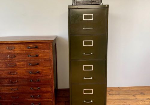 A great set of original mid century steel filing drawers in the best perfectly aged green colour. Produced by Roneo Vickers in the 1960’s the drawers are in a superb colour and condition, with all original handles and label holders. A very nice size for home or office. The cabinet and drawers have all been fully cleaned and the runners re-oiled. Superb condition for its age with plenty of industrial design and character. Industrial style and practicality all rolled in to one.