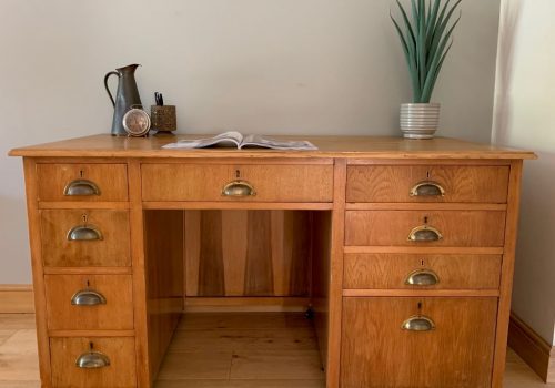 This style of desk is often referred to as teachers desks but this one was definitely a study desk. We love the story, the handmade imperfections and the aged colour and patina of it. It is now available for somebody else to love and use.