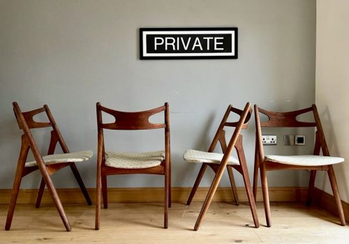 We have a set of these four gorgeous and rare dining chairs designed by Hans Wegner for Carl Hansen & Son (production) in the 1950’s. The chairs are constructed from oak. The seats have been later recovered and now need reupholstering to your individual taste. Or the covers can be stripped off and the seats restored back to wood. Fully restored these chairs sell for in excess of £4000. Grab an opportunity to get these amazing and rare chairs at a fraction of that price and get them exactly as you would like them.