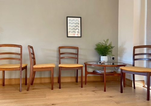 We have a set of these four gorgeous and dining chairs produced by GPlan, with their original makers labels for authenticity. The chairs are constructed from quality teak with beautiful design and a really nice solid weight; reflective of the quality of teak used. We reupholstered all of the original (stained material) seats in a new fabric to easily accommodate and complement most colour palettes. The colour is darker than the images make it appear. We would say it is a dark gold/ saffron colour ‘in the flesh’. Classic and neutral, in keeping with the age and colour of teak – without being boring.
