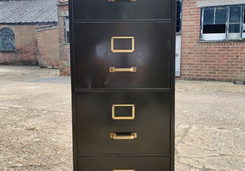An exceptionally clean and original set of mid century steel filing drawers by Vickers (later to become Roneo Vickers, post 1966 buy out of Vickers by Roneo). Great colour, perfect brass ware and a very nice size for home or office. The cabinet comes complete with key for the lock. The cabinet and drawers have all been fully cleaned and the runners re-oiled. Superb condition. Industrial style and practicality all rolled in to one.