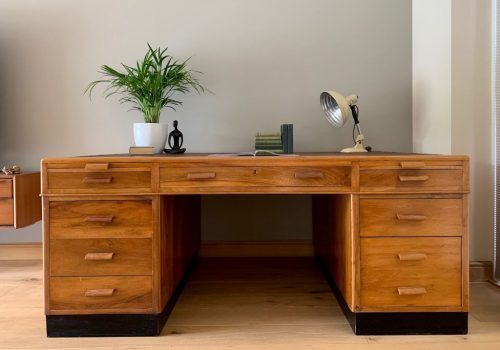A truly exceptional partners desk dating form the early 20th Century (circa 1930-40). It is constructed from quality English walnut throughout. It came from the private home office of two very successful UK architects. Incredible design, build quality, size and presence. Everything is on offer with this big bold beautiful desk. It is double sided, with drawers to the front and cupboards to the rear of the pedestals. Eight drawers in total with a double height filing drawer to the bottom of the right hand pedestal. Minimal sign of wear and imperfections given the age and use of this incredible desk. Just think of the UK buildings that have been designed and worked upon on top of this desk…..