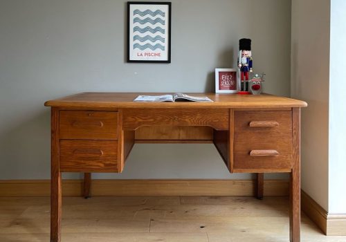 An exceptional and rare 1960’s desk handmade by the world renowned Gordon Russell of Broadway. The desk is hand made from high quality oak, which has beautiful grain. The top drawer has its original working lock and one key. There is evidence of a repair to the top rear corner of the desk. A good quality repair in oak but we have to detail this for accuracy and transparency (please see photograph). This is reflected in the lower price (these desks sell at £795-895). We could not find another example of this design in our research. We saw a close example with three drawers in each pedestal but could not find this design at all. Clearly a very rare model. With stunning mid century lines, fantastic proportions and it’s designer, this desk will be very highly sought after. Just a beautiful desk that is the perfect size for home. A true design classic.