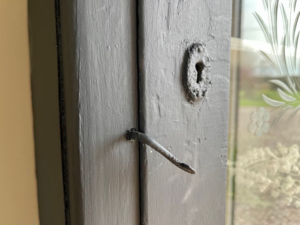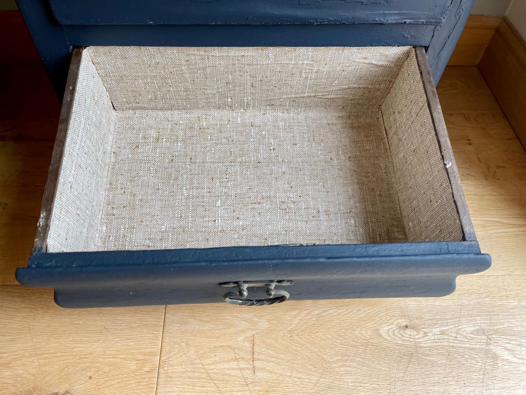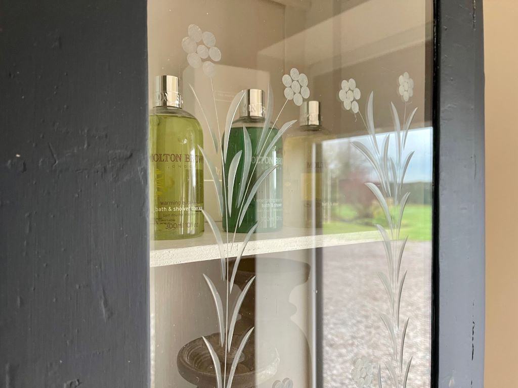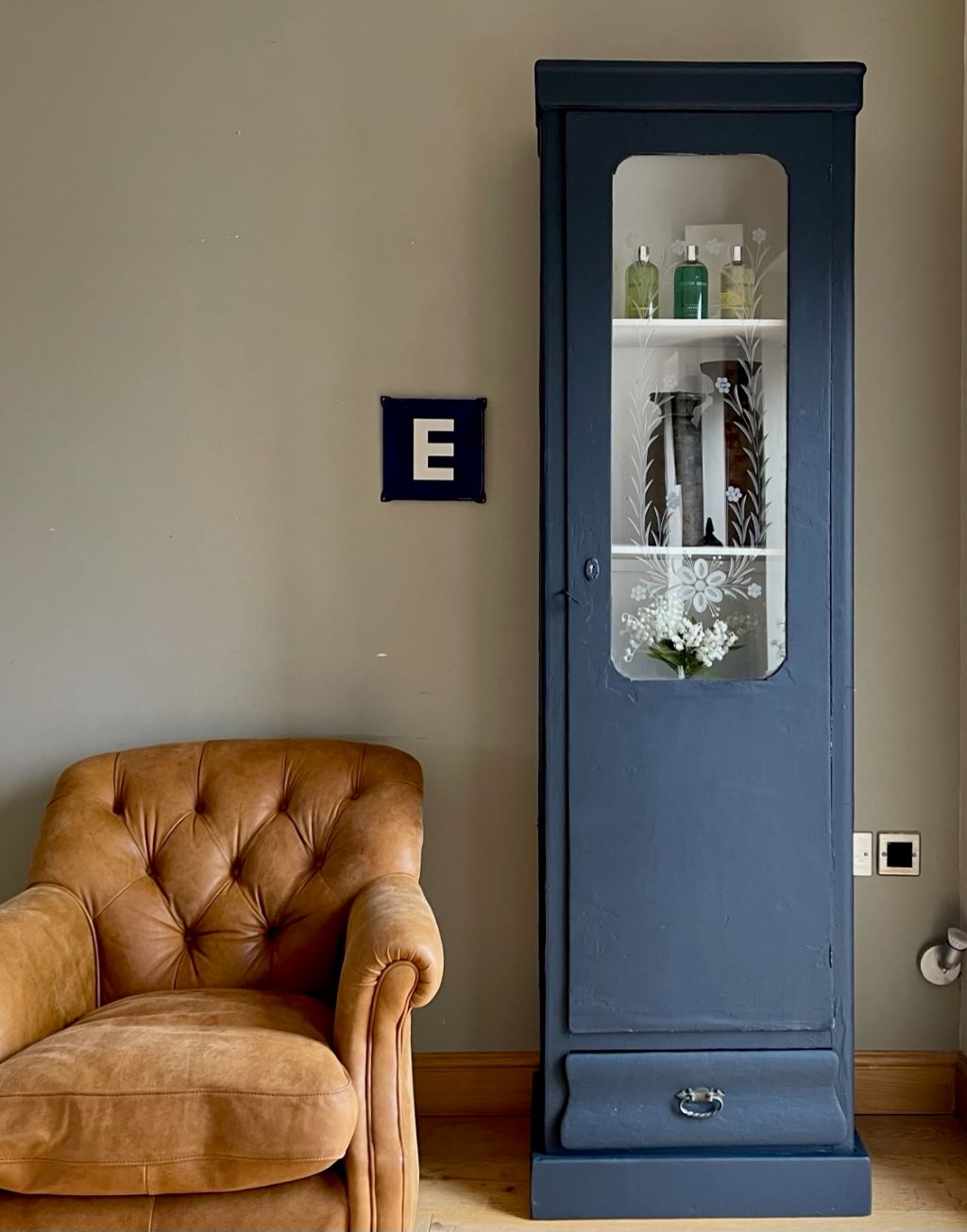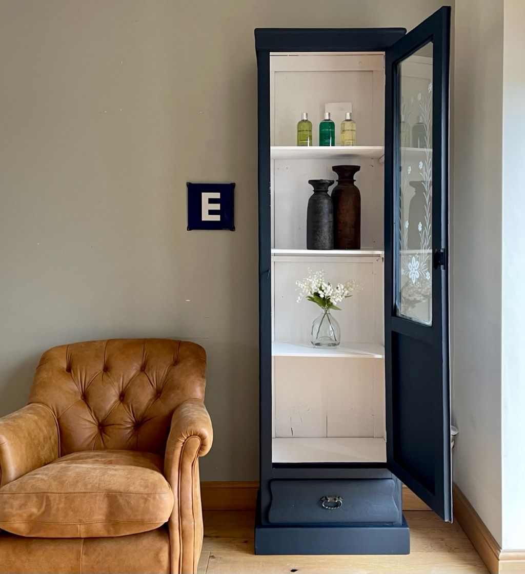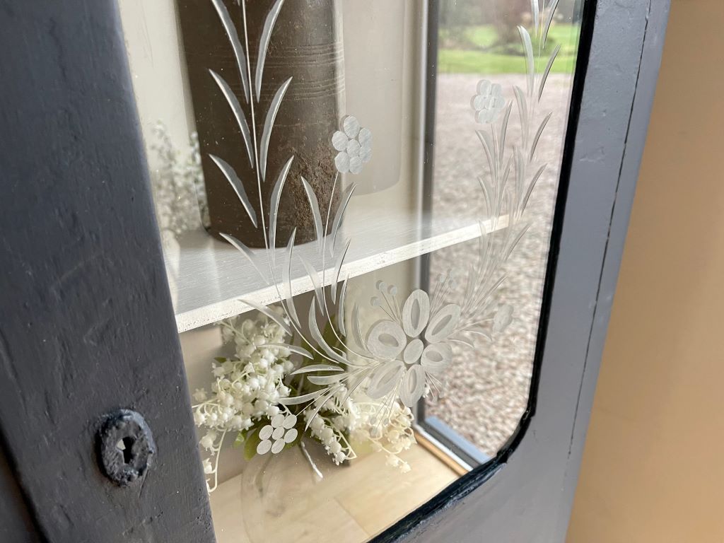 A gorgeous early 20th century glazed cabinet from Budapest. It dates from around the late 1920’s to early 1930’s and has completely original cabinetry, glass, and bottom drawer. It is a rustic piece, completely original in construction with some beautiful hand carved glass etchings on the front panel. We adore the floral pattern and amount of time the etching would have taken a skilled craftsman. The cabinet came to us in a pretty horribly coloured bottle green and unpainted interior. We refinished the piece in a beautifully rich French Navy with the interior painted in Farrow & Ball Wevet. We adore the contrast of the two colours making the piece fresh and contemporary – but retaining all of the original rustic charm and that glass!