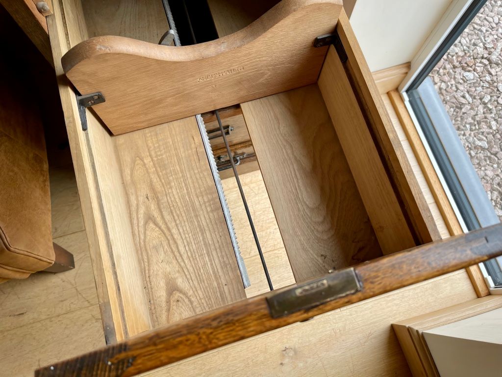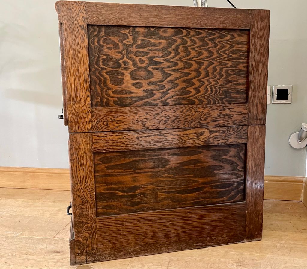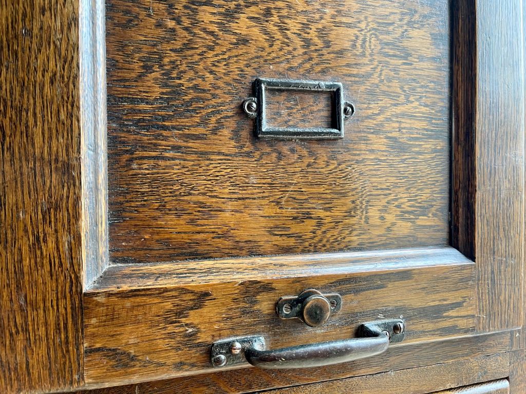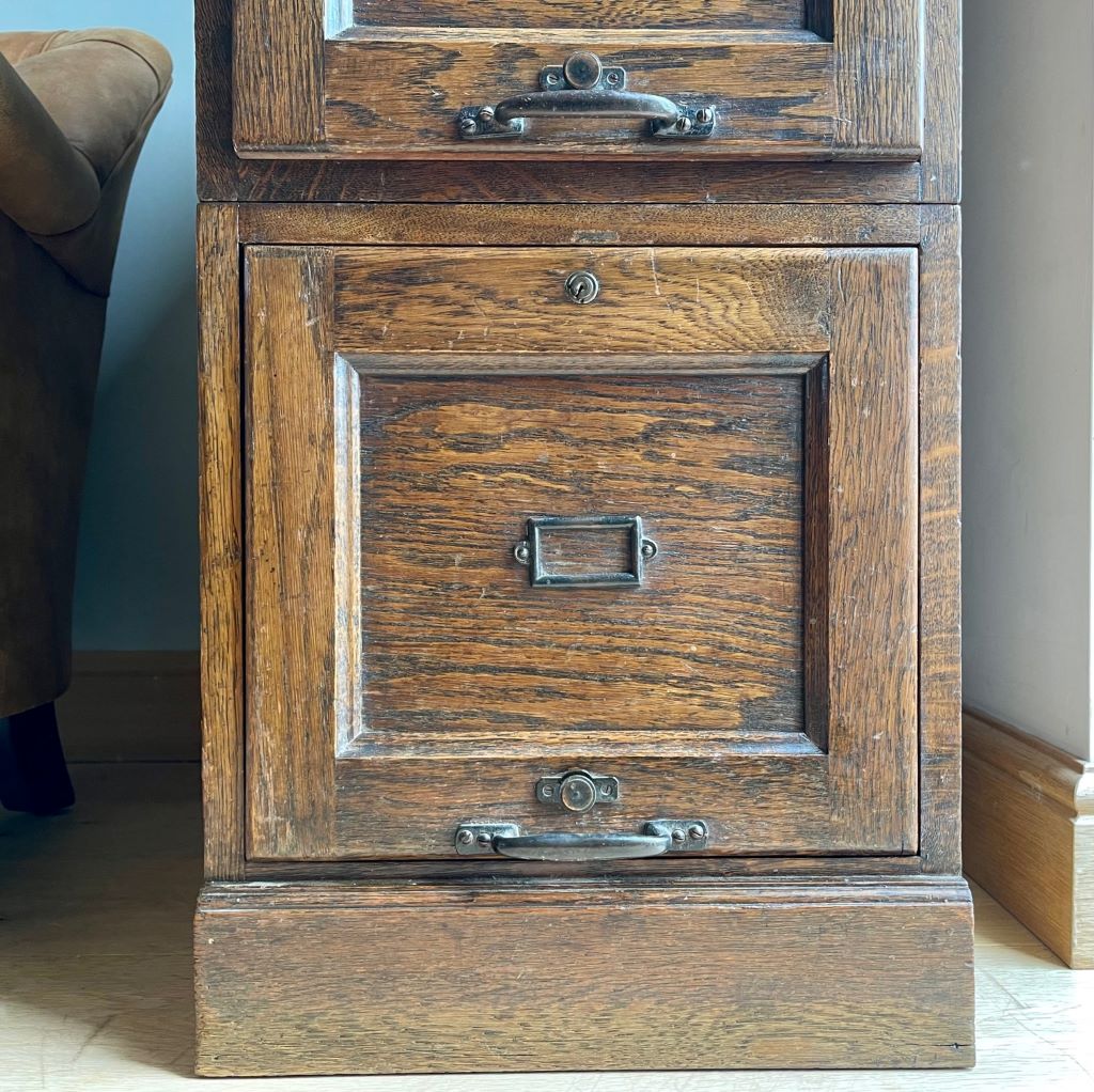 A superb original 1920’s filing cabinet in beautiful oak by Angus of London. Angus produced some superb oak office furniture throughout the early to mid 20th Century. This is an early example as the patented filing system was stamped in to the wood inside. The frame is constructed from solid oak with beautifully aged colour and grain. Even the drawer internals are solid thick oak. The piece is completely original throughout with superbly aged brass handles and label holders. The age of the piece shows on the oxidisation of the hardware – something that only time can do! The drawers split in to two for ease of moving. The drawer internals are very clean and the drawers run free and easy.