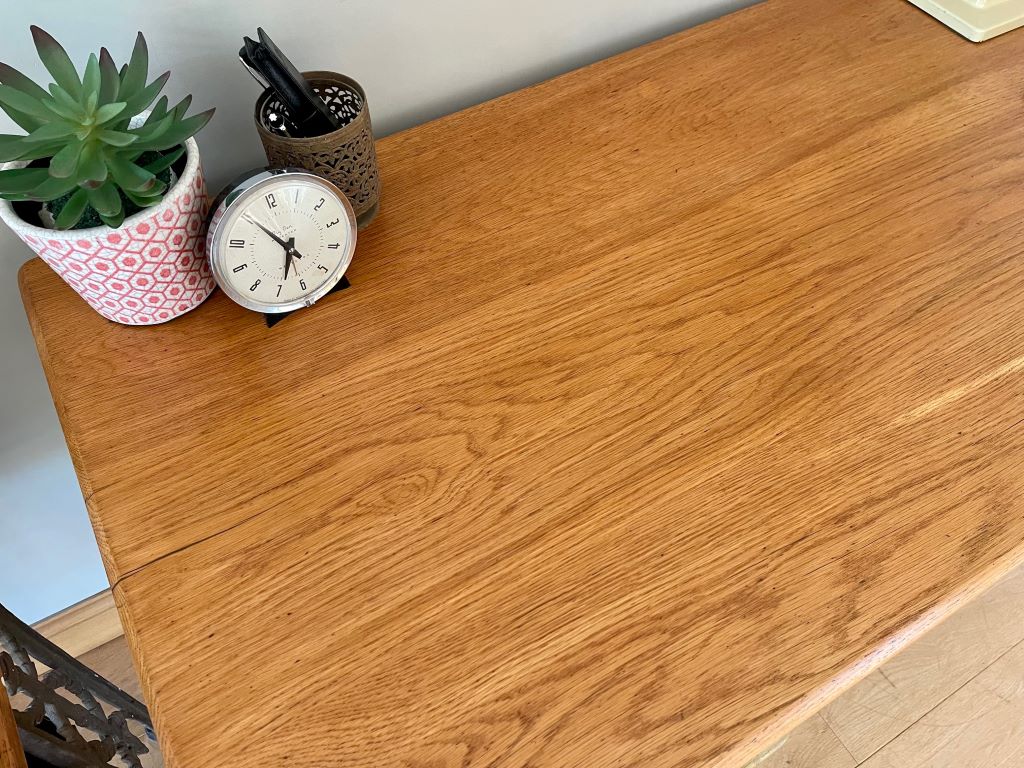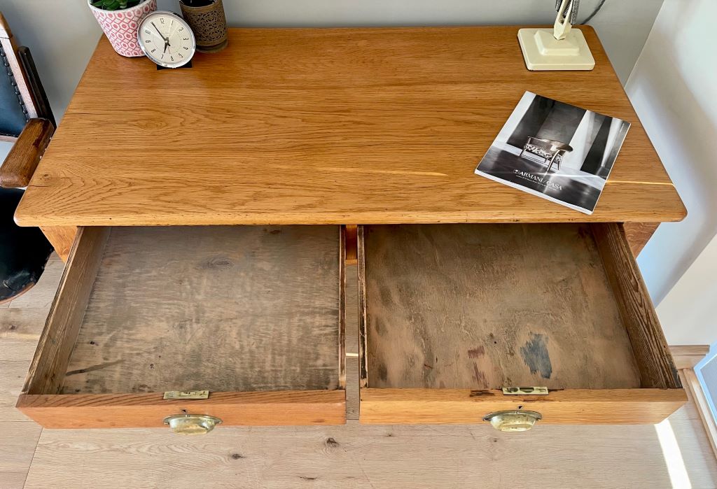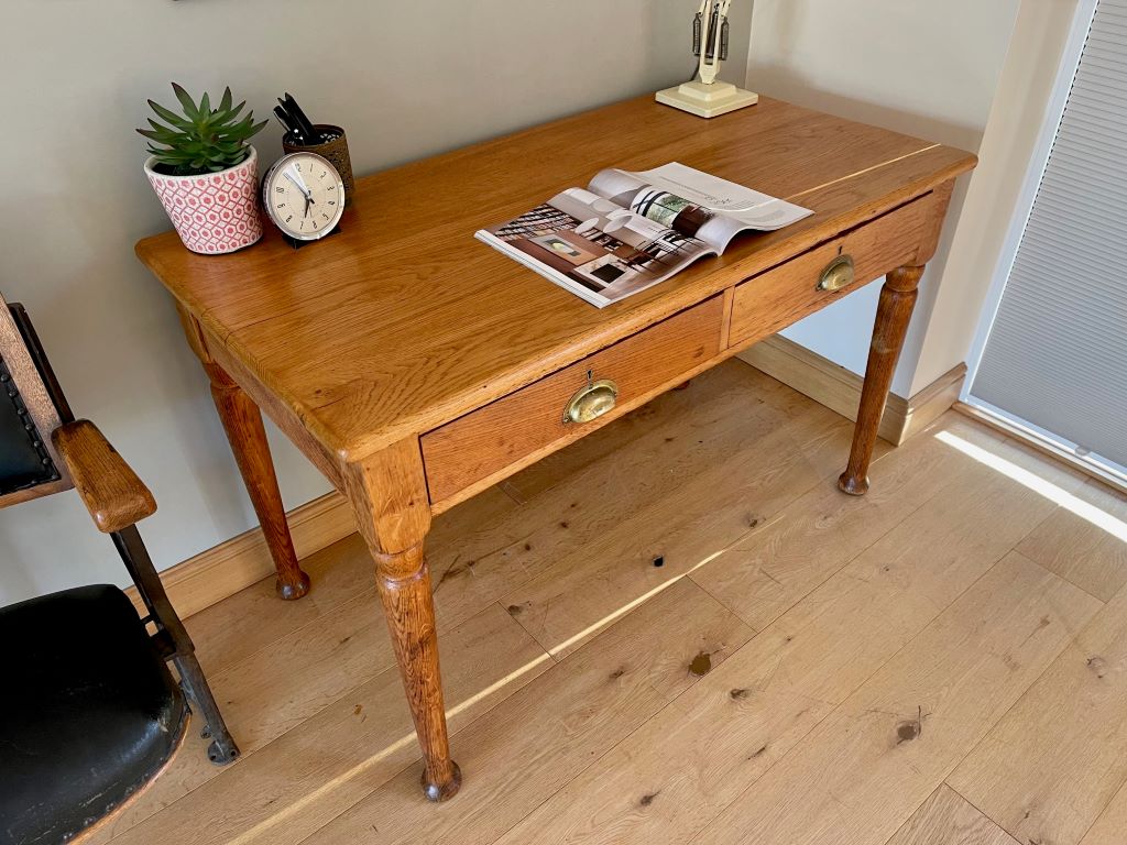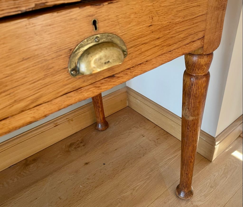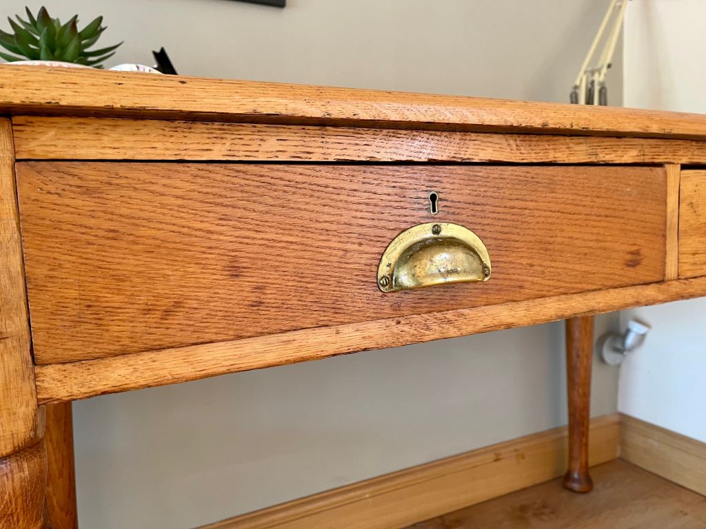A beautiful antique desk in solid English oak, dating from the late 192o’s. We sourced four of these desk directly from a school in Lancashire where they have been used since new. The school opened in 1921 and these desks were supplied a few years later. They are complete original with the LLC (Lancashire Council) stamp on each desk. The brass cup handles are also original. We adore the shape of the legs and that the desks are not too big for you to be able to accommodate at home. A very nicely sized work surface but not a mission to be able to get in to the room you need.