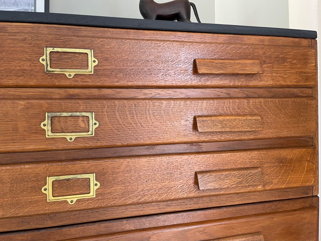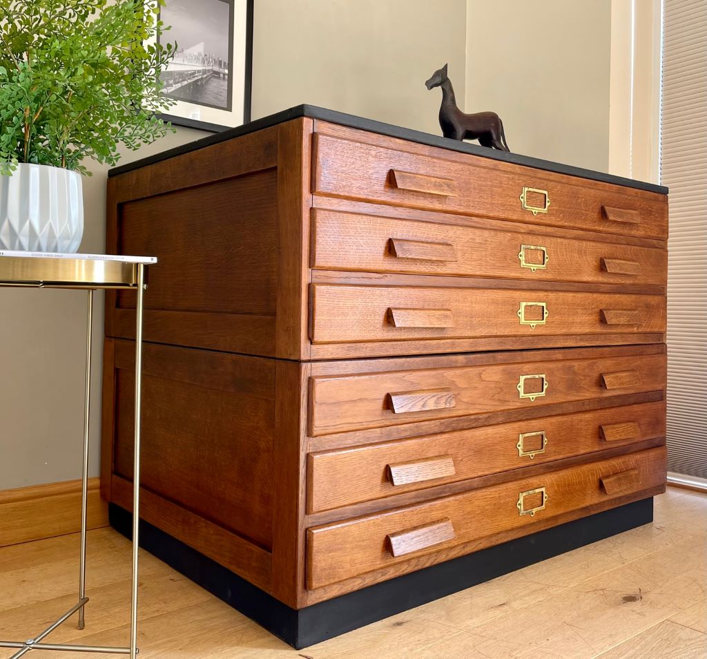 A superb 6 drawer Architect/ Plan chest of drawers in oak. The chest came to us from an Architect’s family in Berkshire, where it had been owned from new. The original owner used the chest to store his drawings and work in progress. We restored the chest to its former glory and gave it a good clean. The top and bottom plinth were repainted in black and finished with a clear wax for protection. The chest does split in to three sections for ease of transportation and siting (two sections of three drawers, plus the base) All of the drawers run freely and are free from any chips or the usual marks. These chest are becoming very highly sought after and are rarely available in such beautiful condition. This set is a real treasure to look after and adore.