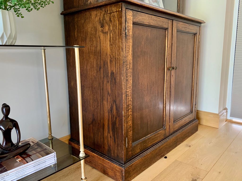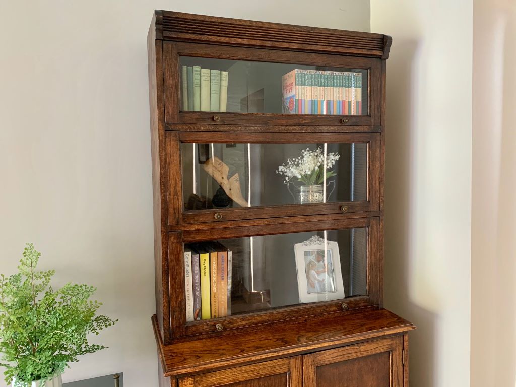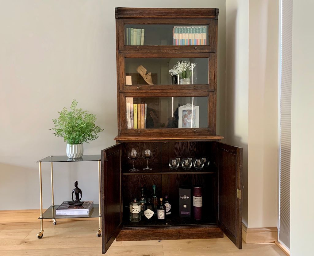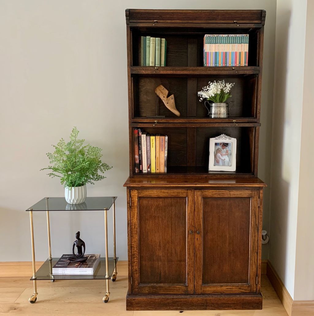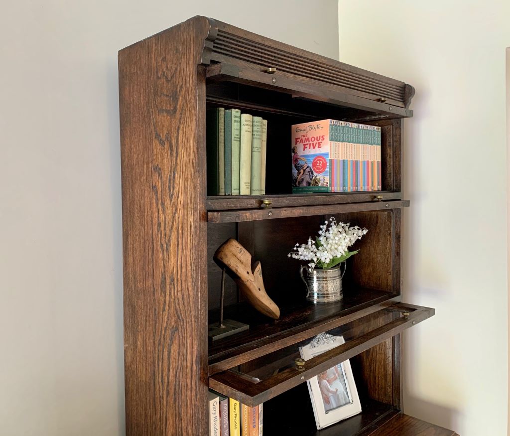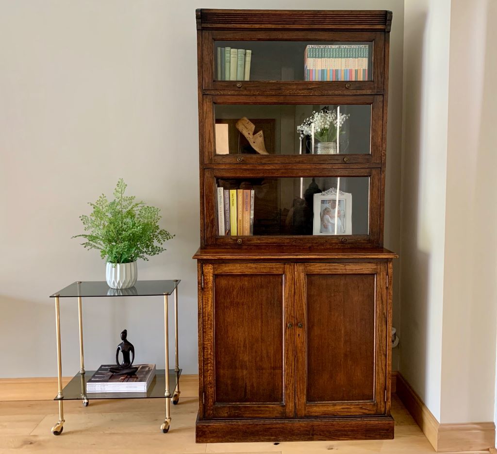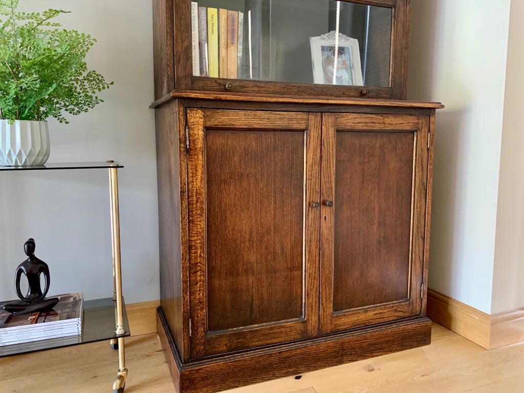 This is a beautiful example of a Barrister’s style bookcase in English oak. It dates from around the early 1930’s and offers lots of fantastic storage. The three upper sections are graduated in size to accommodate larger books in the bottom section, to smaller books in the upper sections. Heights and dimensions are listed below. All three upper sections retain their up and over door opening mechanisms, the original glass and very pretty original brass handles. The lower section is a very generous cupboard in both height and depth. Again with original brass handles. Inside there is one shelf that is fully height adjustable via its original brass support system. Simply remove the brass supports and put them in to higher or lower slots in the channels at the side.