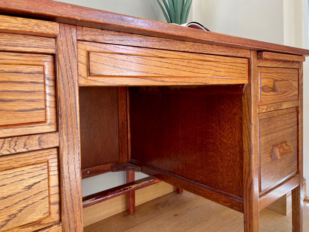 A gorgeous 1930’s double pedestal desk in a honey coloured oak. The desk dates from around the late 1920’s to late 1930’s and is in beautiful condition, fully cleaned and gently restored by us. This desk came to us from a private owner in Bedfordshire. It is presented in a beautifully aged colour and patina with a really nicely sized work surface for home use. The drawers run freely and have been cleaned internally. The bottom right hand drawer is a double height filing drawer. There are two pull out shelves to the top of both pedestals. Just look at that beautiful oak colour and grain – gorgeous!