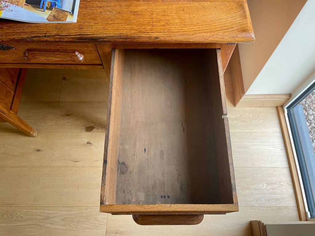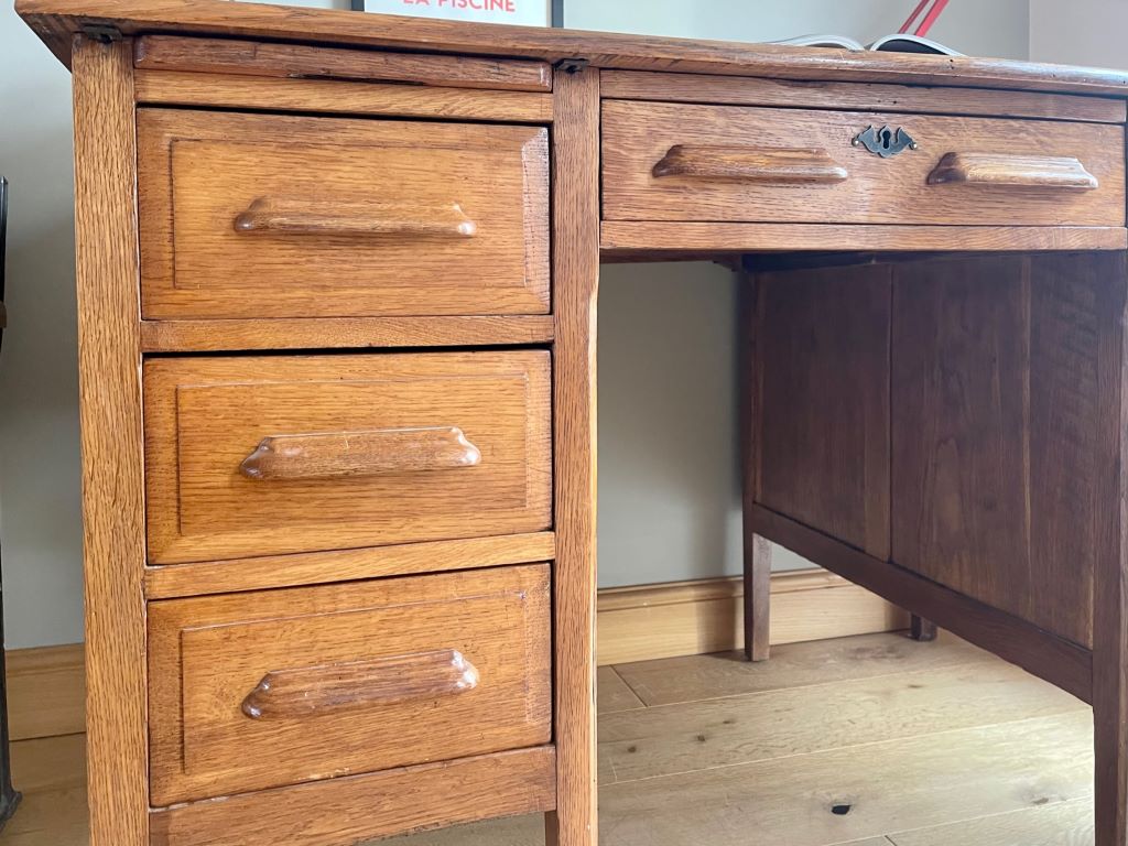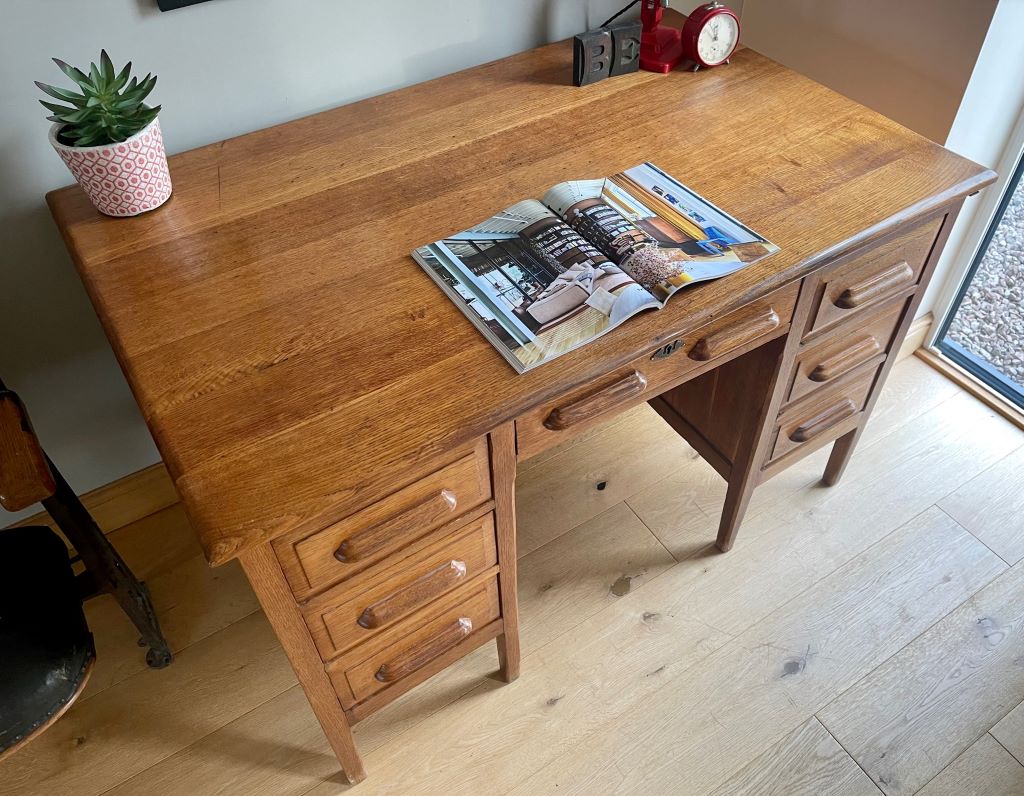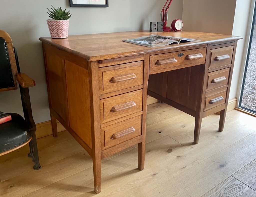 A beautiful double pedestal teachers desk in a beautifully aged golden oak colour. It dates from the 1930’s and is in completely original condition but fully cleaned and gently restored by us. The size is fantastic. Not too large to be able to accommodate at home but offering lots of storage and a really nicely sized work surface for home use. All six drawers are clean and free running. The bottom right hand drawer is a double height deep filing type drawer for extra storage.