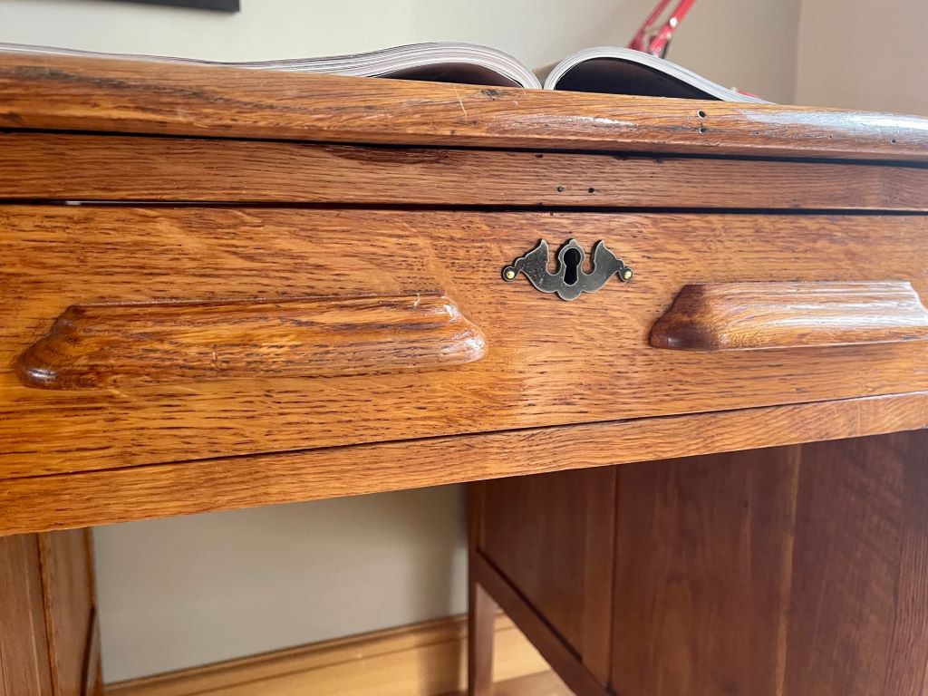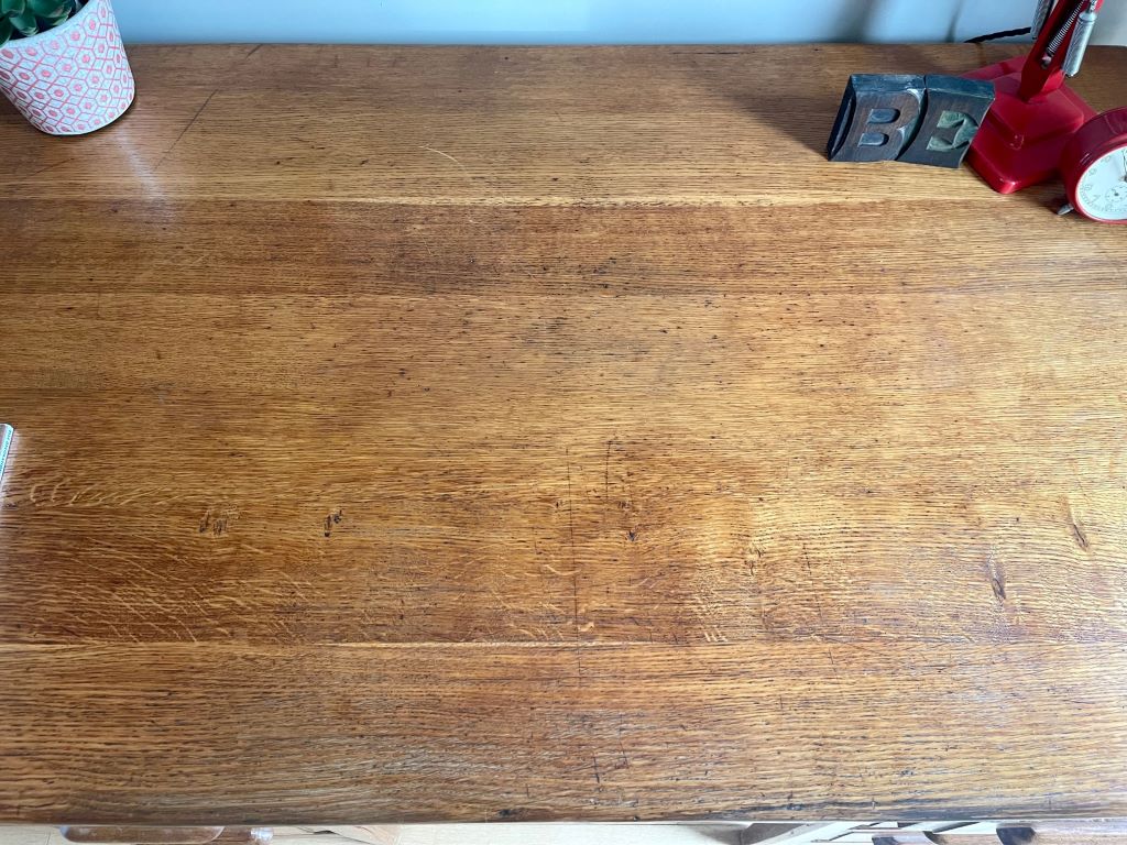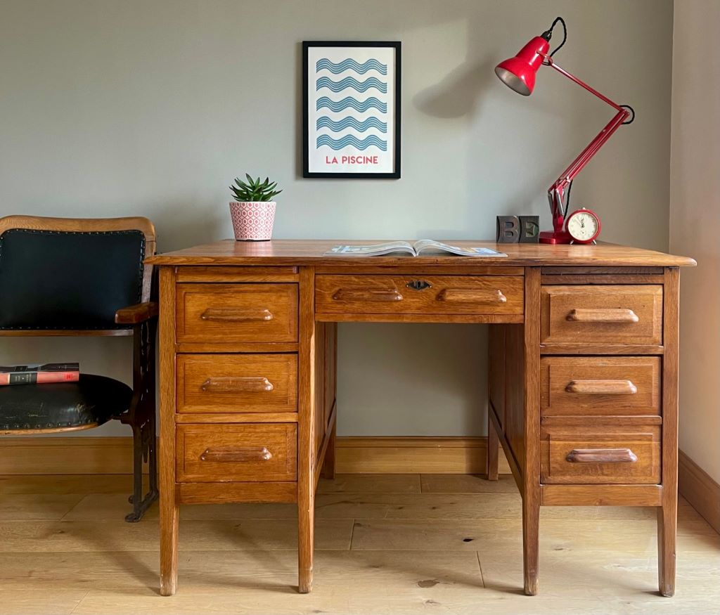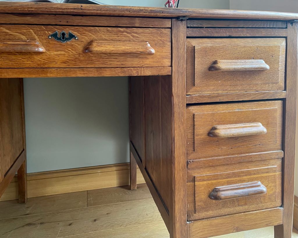 A beautiful double pedestal teachers desk in a beautifully aged golden oak colour. It dates from the 1930’s and is in completely original condition but fully cleaned and gently restored by us. The size is fantastic. Not too large to be able to accommodate at home but offering lots of storage and a really nicely sized work surface for home use. All six drawers are clean and free running. The bottom right hand drawer is a double height deep filing type drawer for extra storage.