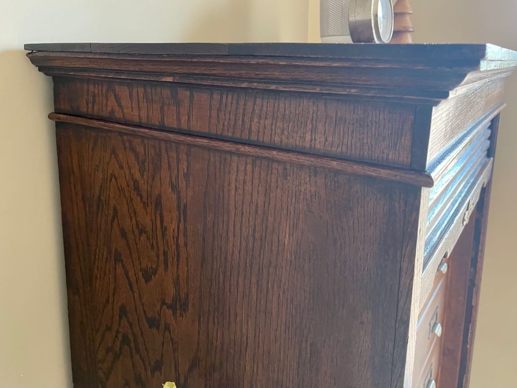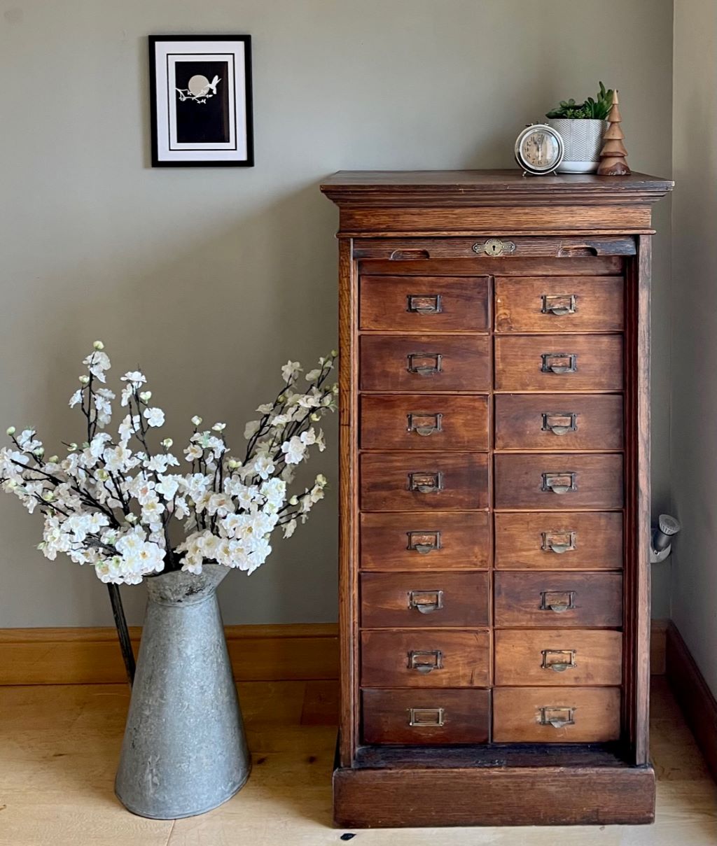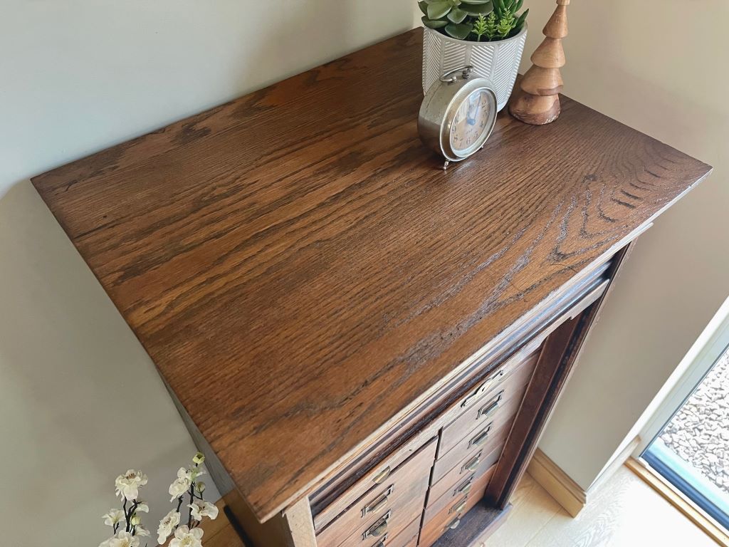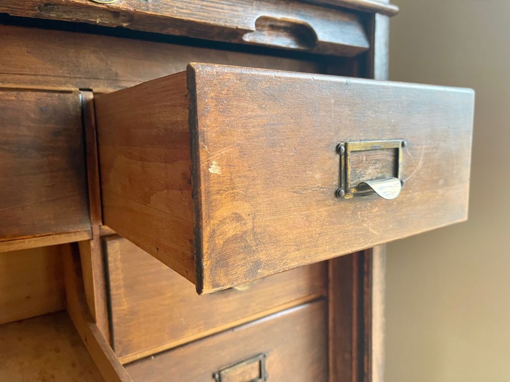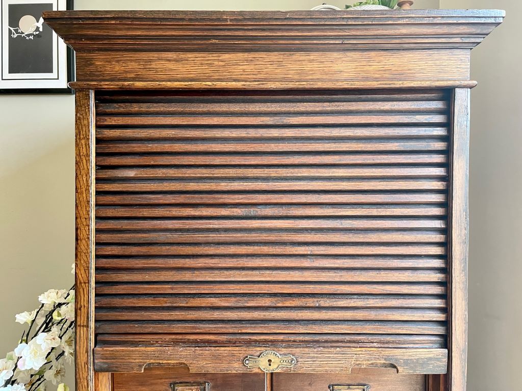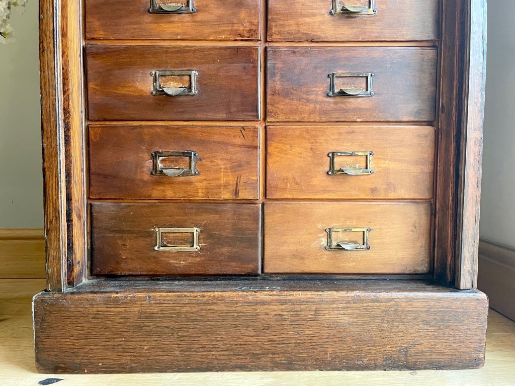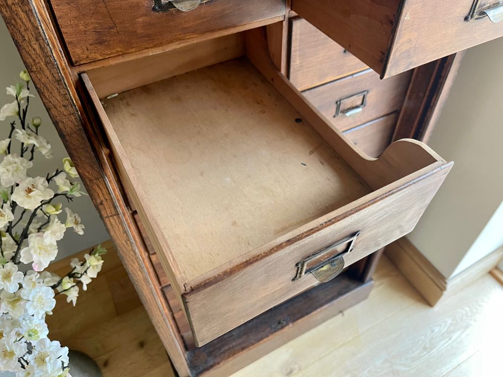 An amazing tambour cabinet in Oak, dating from the 1930’s. The cabinet comes with all of its original pull out haberdashery type drawers and brass label holders, which are just gorgeous. The right hand side of each drawer is scooped, as these cupboards originally held paperwork/ filing in each drawer. The bottom two drawers do not open, they are fixed fascias. All other 14 drawers open as they should. The door runs well though the lock has been removed. The condition of the oak cabinet is solid and in very good order for its age. The drawer fronts have their original and natural colour variations due to the grain and patination over the years.