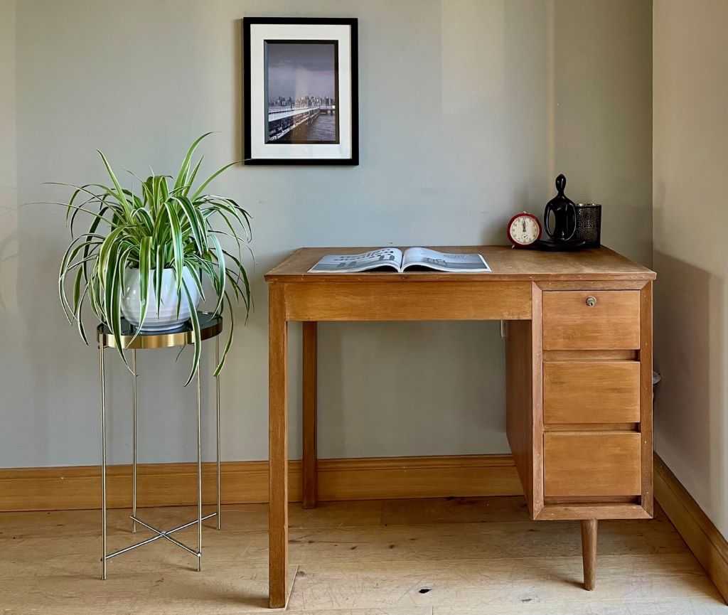 A compact but stylish 1960’s desk with a very mid Century Danish look. This desk has perfectly simple lines and is very much of the mid century Scandinavian design ethos. We couldn’t find any makers stamps or labels though. The desk would be perfect for a tighter space, occasional use or as a child’s study desk. It is a standard height adult sized desk at 76.5cm high. With three clean and free running drawers it offers plenty of storage for its size. The top drawer is lockable via its original lock and one key.