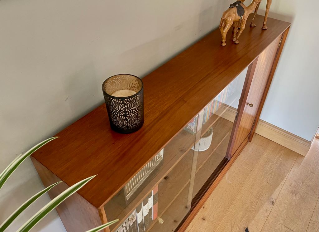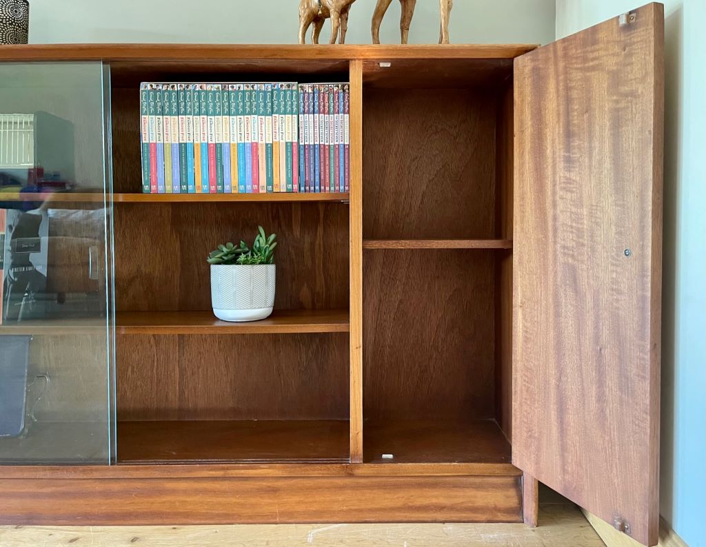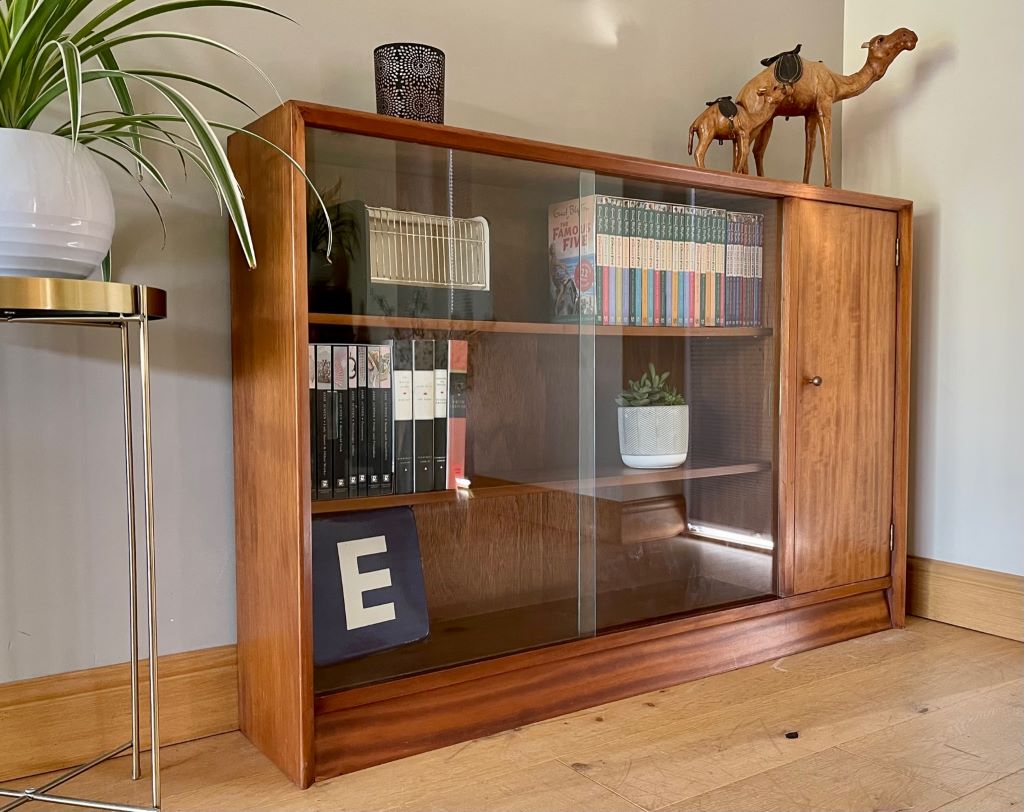An excellent example of an original mid century low glazed bookcase/ unit/ sideboard in solid with original glass sliding doors. Produced around the 1960’s this is a really clean and completely original example. It is the earlier and better quality Gold Label Autograph range by Herbert Gibbs. A great size, superb colour with original adjustable shelves and original glass. With a slim cupboard to the right hand side it offers super flexible storage for the things you want to see and the more unsightly but necessary things tucked away.