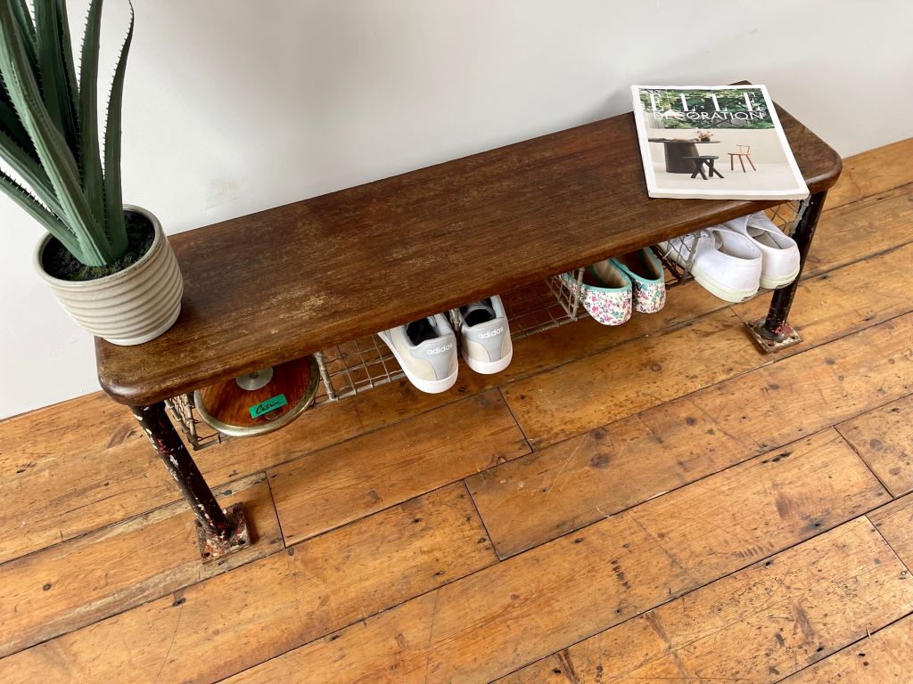 This old school gym/ changing bench dates to the early 1960’s and came to us straight from a school near Cambridge. It is in completely original condition; fully stable with no wobbles and perfectly aged wear on the baskets, legs and solid hardwood top. Constructed from heavy gauge steel tube with original paint and patina. It has a really good solid weight and looks fantastic We just gave it a good clean, and lightly oiled the seat for replenishment and a refresh.