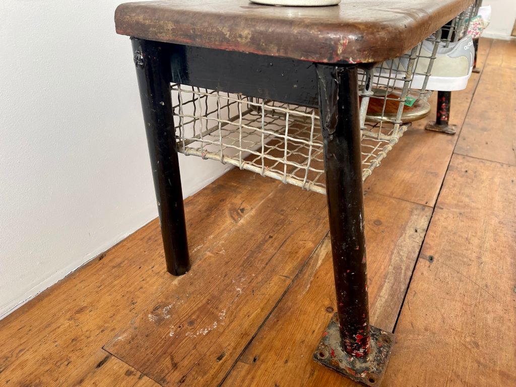 This old school gym/ changing bench dates to the early 1960’s and came to us straight from a school near Cambridge. It is in completely original condition; fully stable with no wobbles and perfectly aged wear on the baskets, legs and solid hardwood top. Constructed from heavy gauge steel tube with original paint and patina. It has a really good solid weight and looks fantastic We just gave it a good clean, and lightly oiled the seat for replenishment and a refresh.