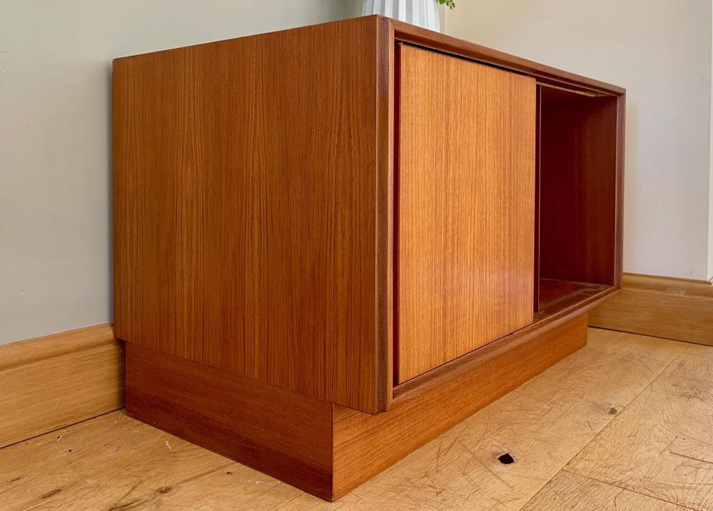 A very stylish and super condition 1970’s cabinet in teak. We think this gorgeous little cabinet would make a great record/ vinyl cupboard, a drinks cabinet, a magazine store or all three! The piece was produced by GPlan from teak and teak veneer with sliding ‘zig-zag’ doors. Very mid Century, very cool and super practical. It retains its original zig zag sliding door mechanism. 100% original and a great piece of flexible furniture. Very on trend at the moment!