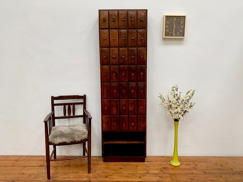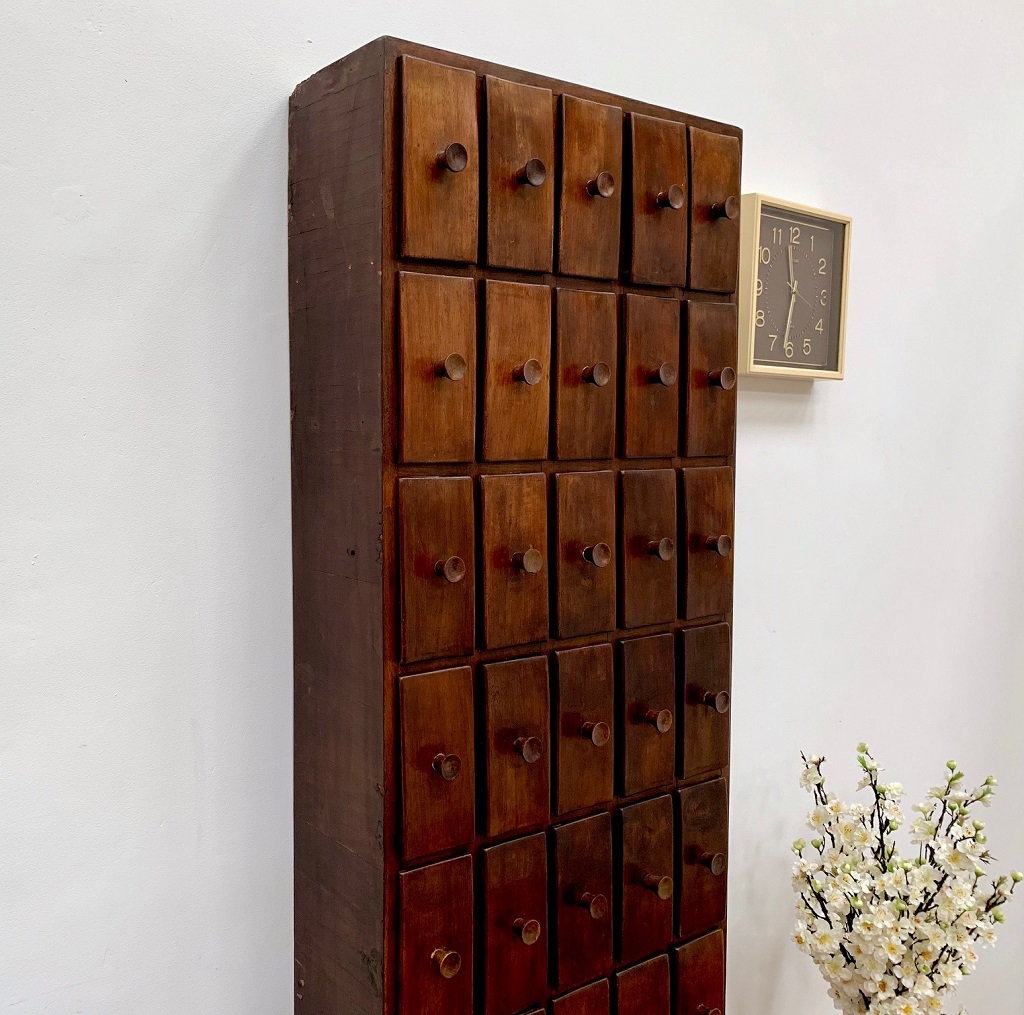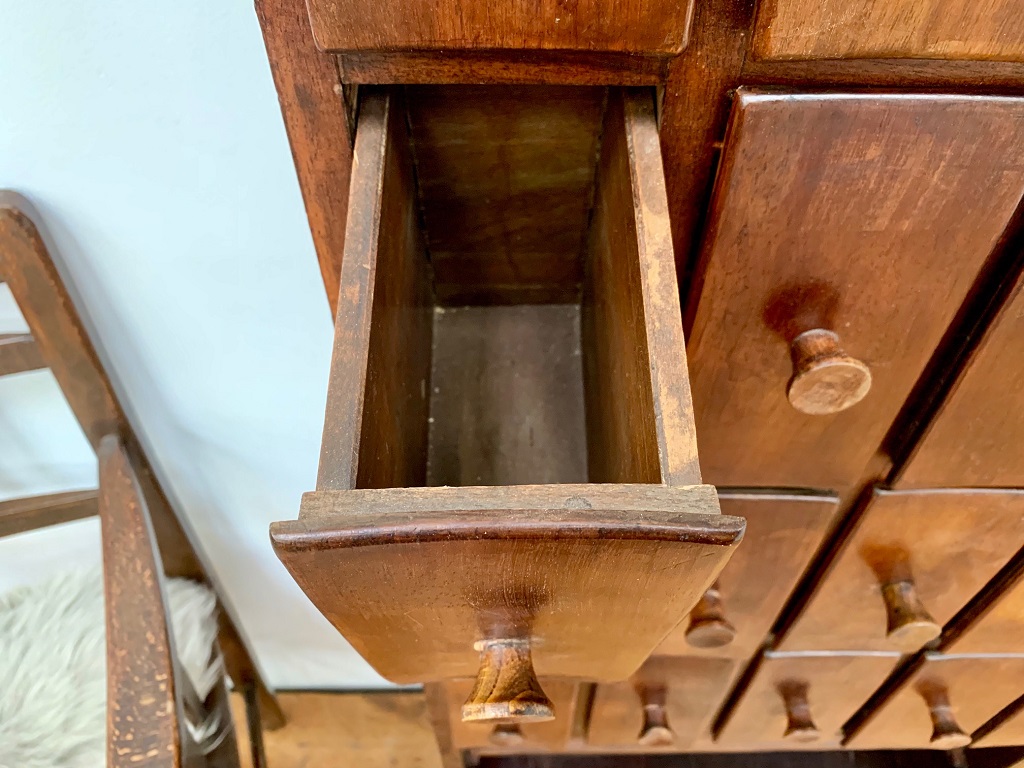 35 drawers in total, all free running. We replaced four handles due to them being missing or damaged. The new were turned in oak by an expert wood turner to match the existing original handles.