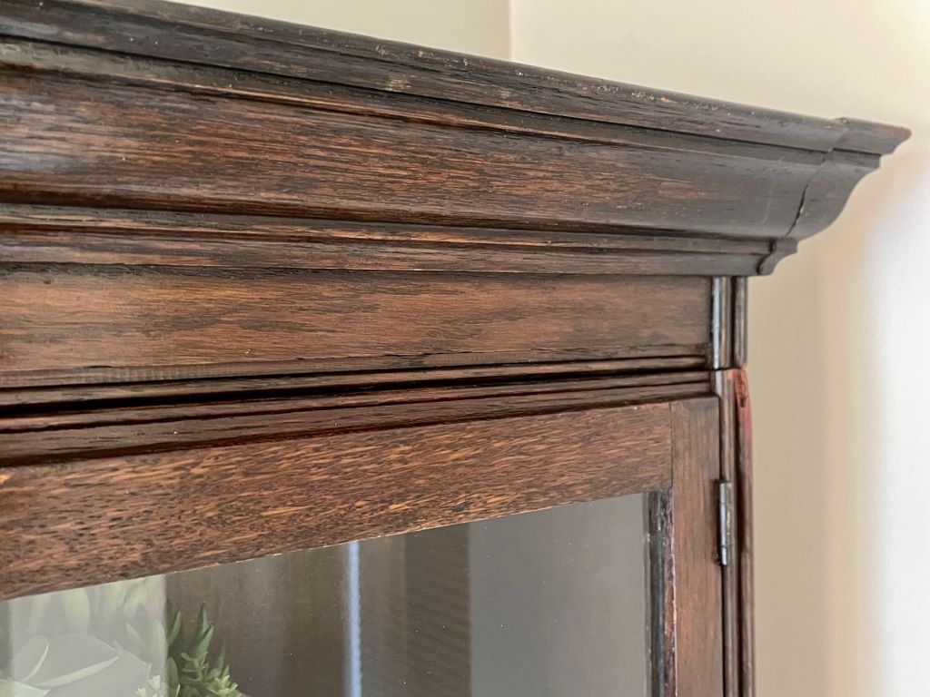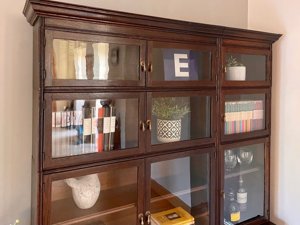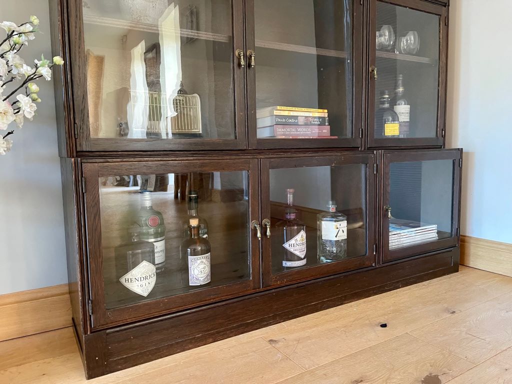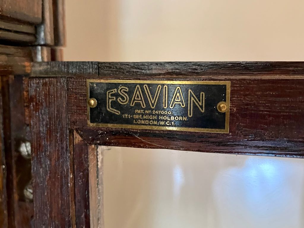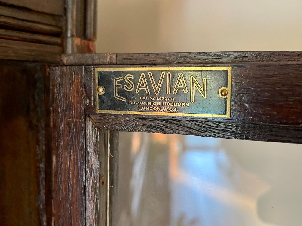 A very rare antique glazed bookcase by ESAVIAN. ESAVIAN (earlier/ also known as ESA  – Education Supply Association) produced much of the furniture that was found in schools in England from the early 1920’s to 1970’s. James Leonard join ESA in 1946 as their chief designer and went on to produce much of the highly sought after mi Century old school furniture (chairs, tables bookcases, etc). This early bookcase pre dates James Leonard joining. We estimate it dates to around the 1920’s to early 1930’s.  It is completely original throughout, with all original glass and brass drop handles. Hand made form oak it breaks down in to many sections for ease of transportation and siting in the space of your choice.