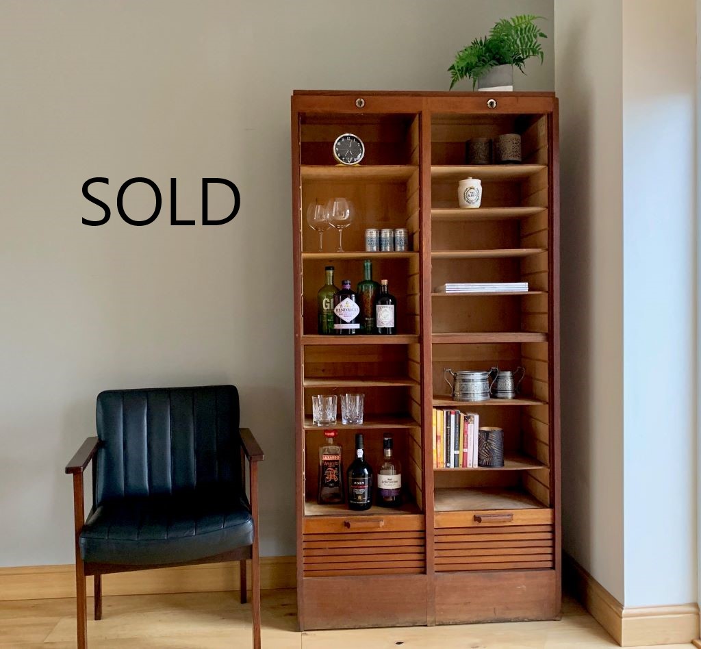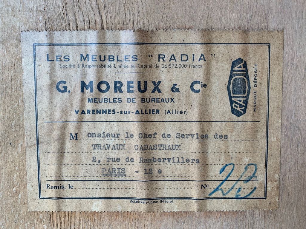 A very nice Antique French double tambour cabinet in Oak, dating from the early 20th Century (c. 1920-30). This is a really good sized example at 180cm/ 6ft tall. It also has a very nice label of provenance on the back, where it was originally supplied to an office on Rue de Rambervillers (Arrondissement 12) . The building has now been converted to very luxurious apartments averaging 2 million Euros to buy. It comes with original locks and two keys, together with lots of removable and adjustable internal shelves.
