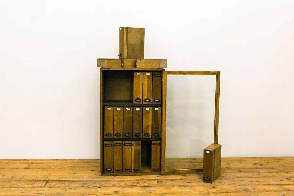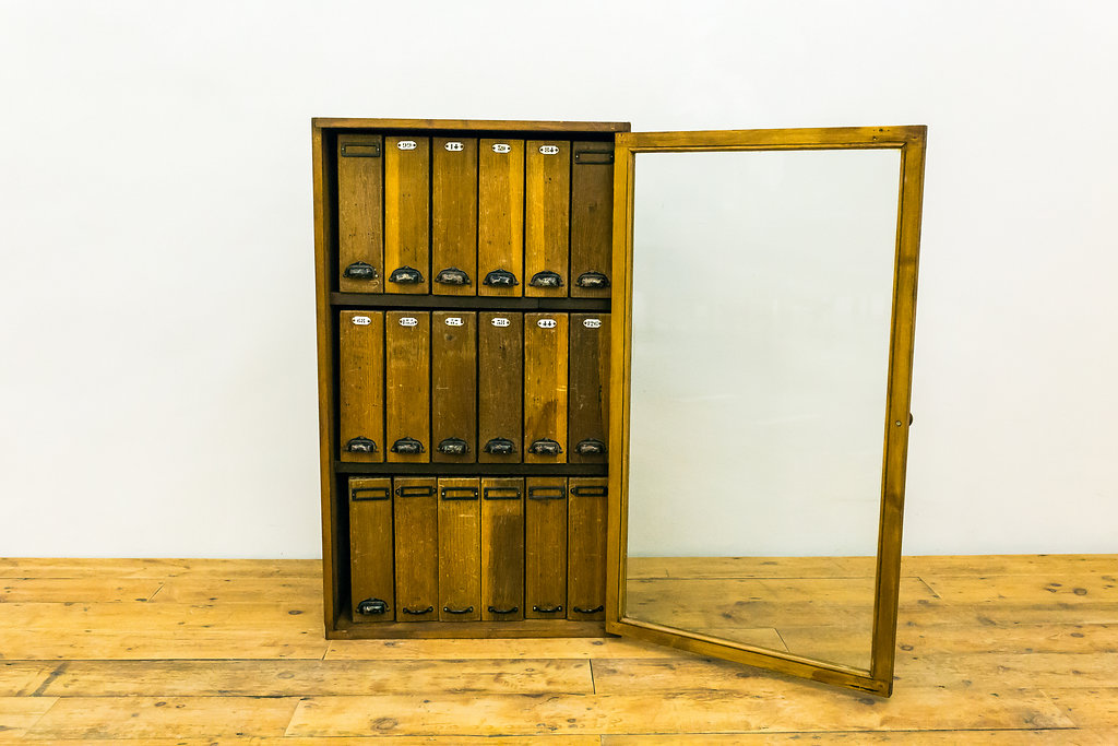 We are very pleased to be able to bring this rare antique piece to our website. A set of 18 original French wooden filing boxes from the early 20th Century in a cabinet. Each wooden box (believed to be French Elm) has through dovetail joints. 16 of the boxes have their original brass closing claps. Circa 3 or 4 boxes also have some French writing, detailing their original contents. Truly stunning condition. This piece raises so many comments and can only get better with age – plus appreciate in value.