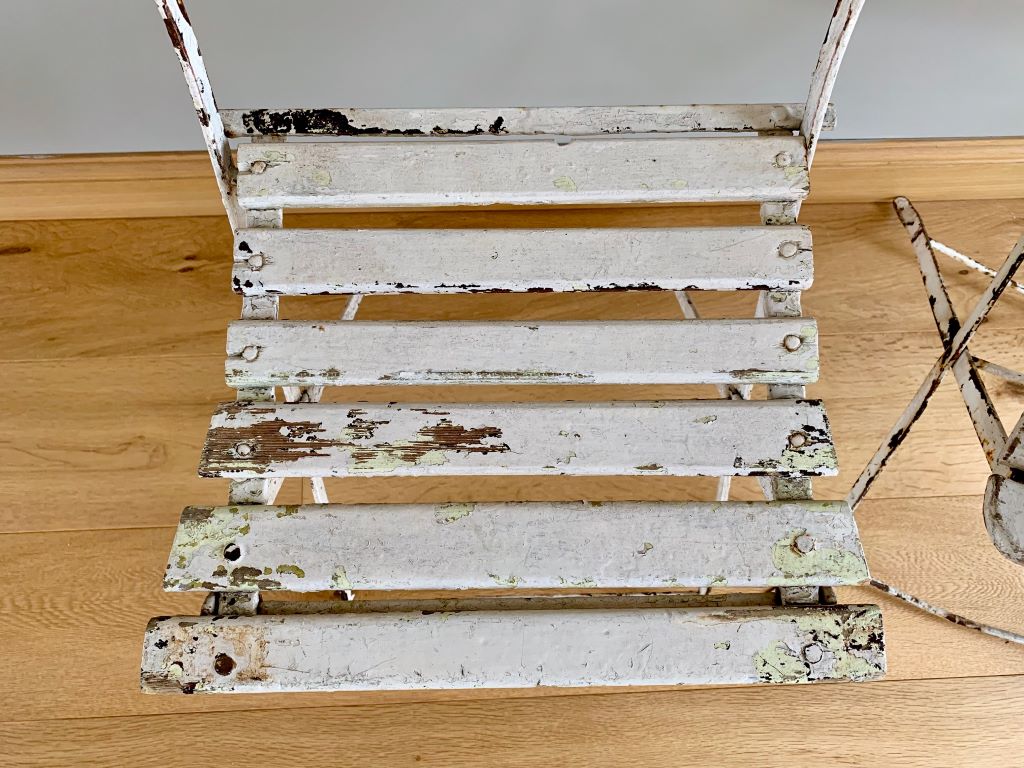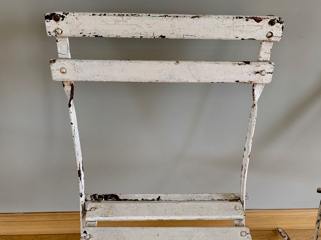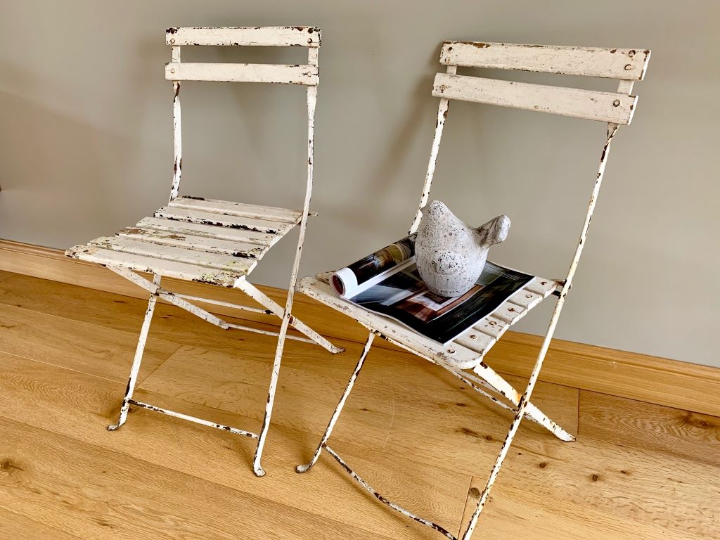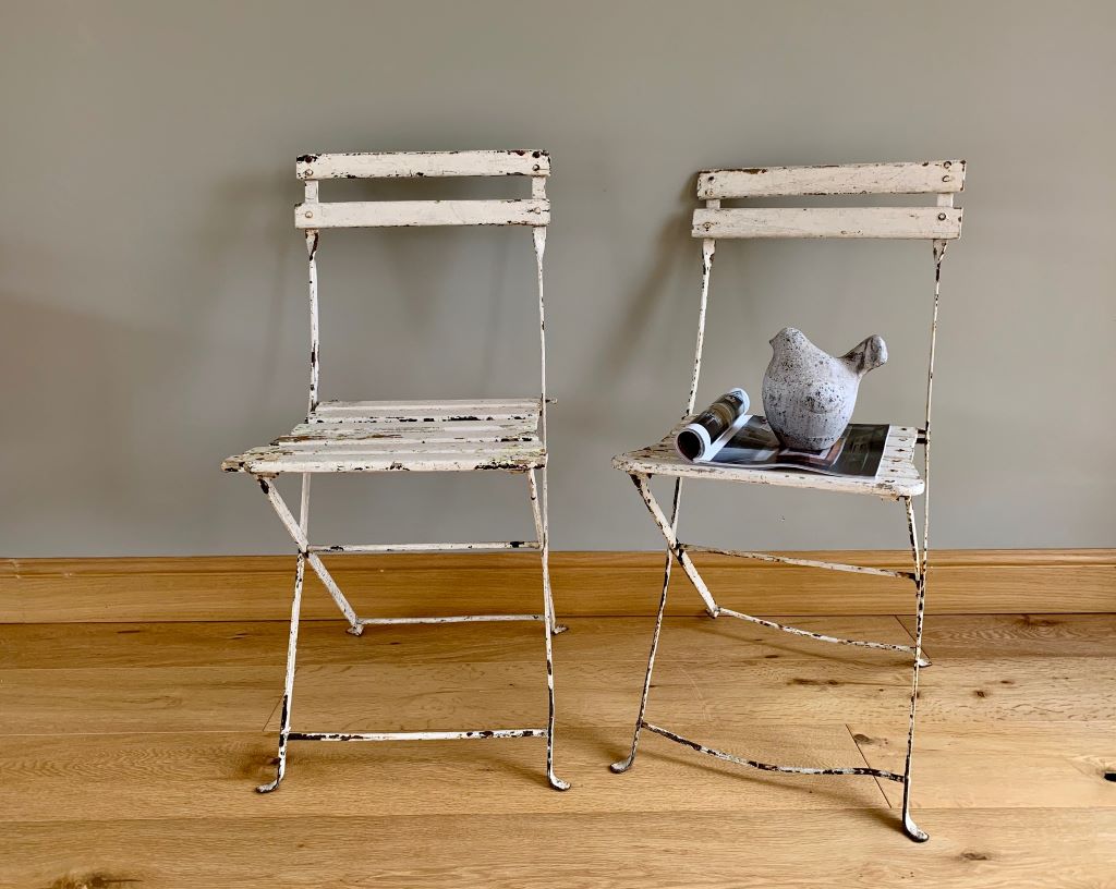 Classic French folding cafe chairs. Both chairs are structurally sound (metal frames and all wooden seat slats). The colour and patina are perfect for the age and style of these chairs. Genuine patina and wear making them just gorgeous. Flexible and fold neatly away when not required. Simple and stylish!