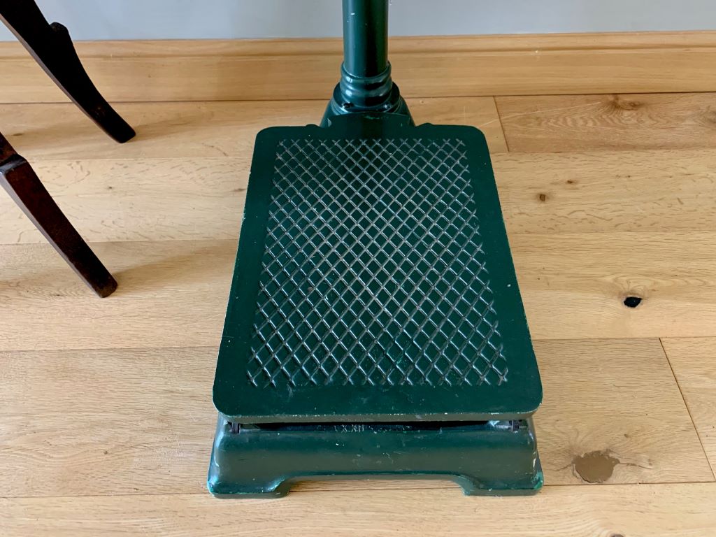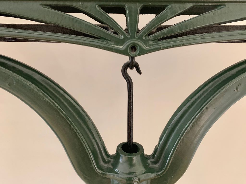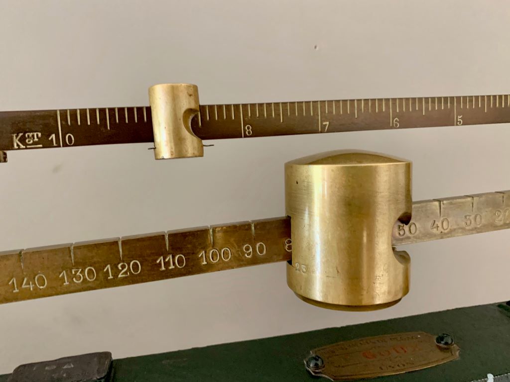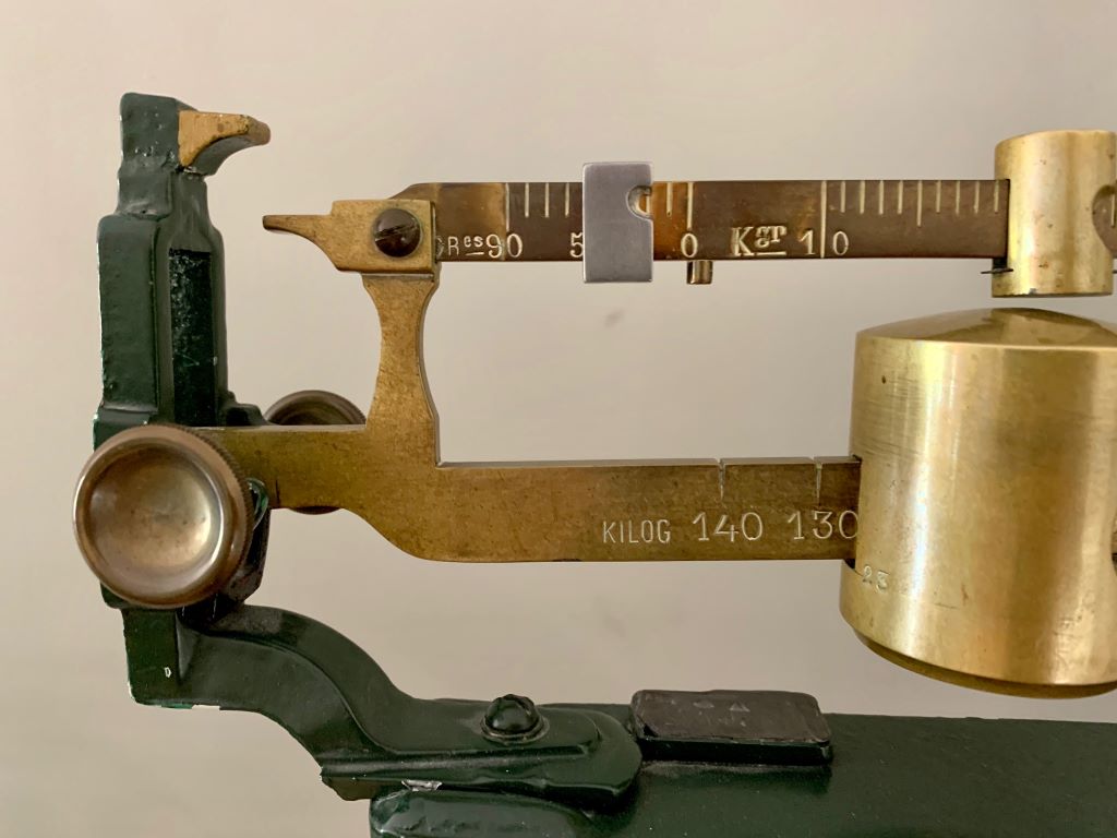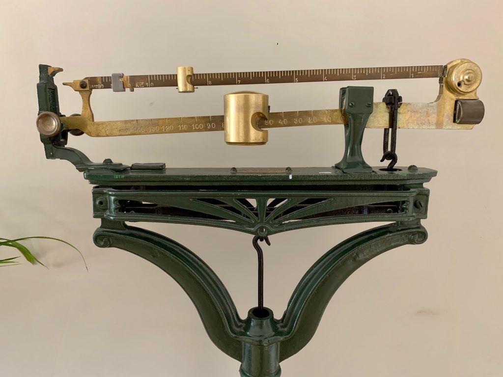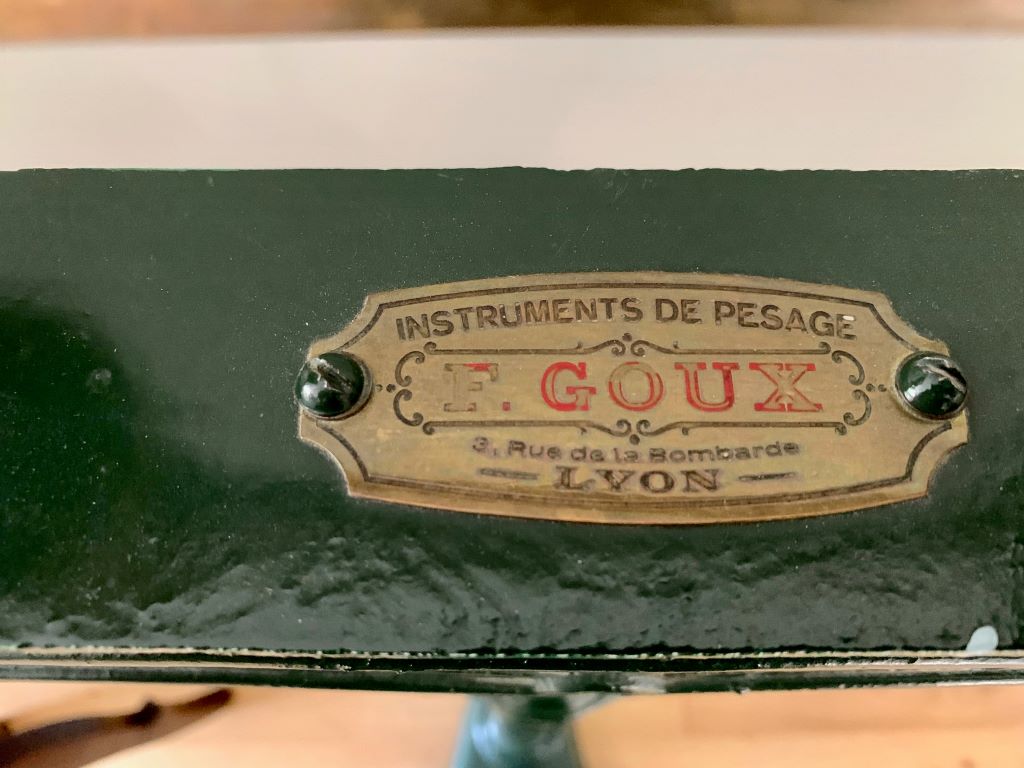 We absolutely adore these original antique weighing scales. Dating from the early 20th Century (1922) and stamped XXII they were produced by quality manufactures F.Goux of Lyon. The scales are predominantly in painted cast iron. The paint is a beautiful aged green. The piece de resistance is the head of the scales with superb detailed cast iron design and even better heavy top quality aged brass. So stunning to look at!