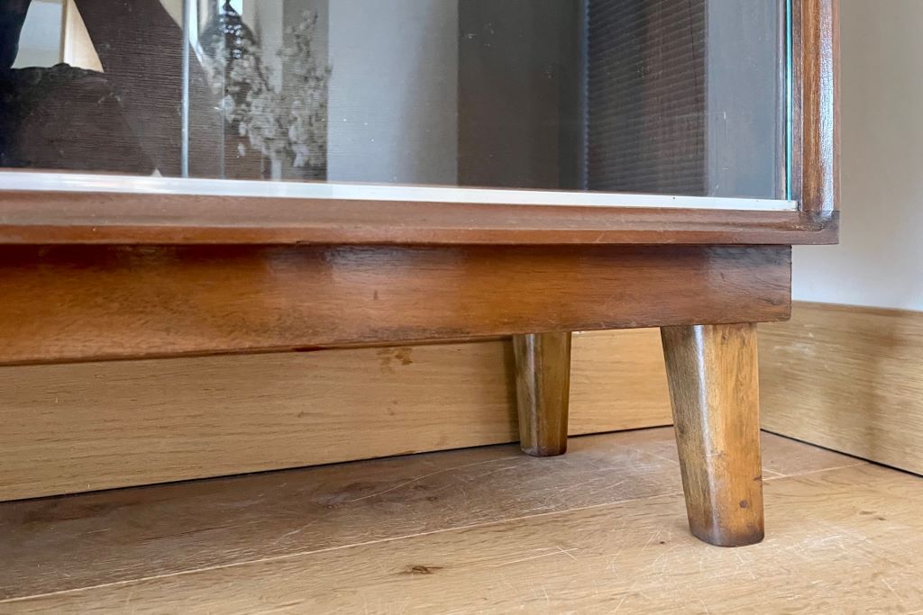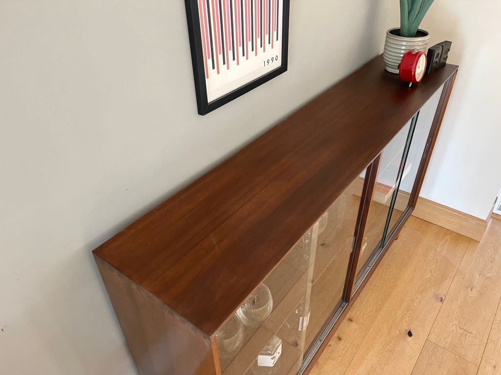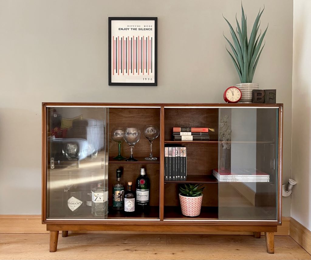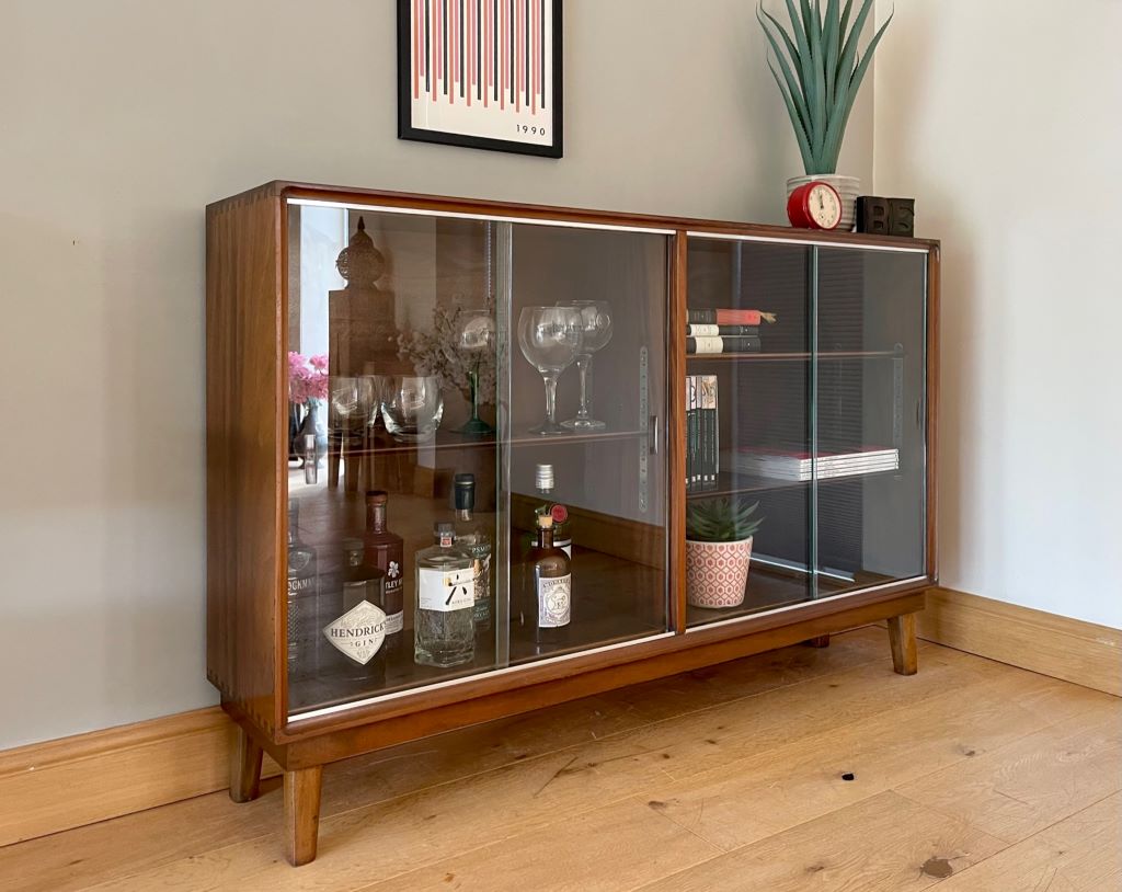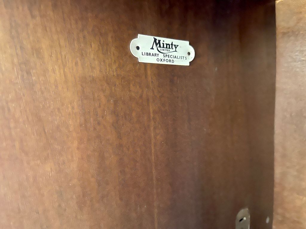 A stunning example of a mid century low glazed book case or drinks cabinet by Minty of Oxford. Minty produced some really nice quality bookcases from the early 20th Century to the late 20th Century, usually in oak. We have not come across this style or size from them before.  It is made from solid walnut with a really nice weight to it, reflective of the quality. All shelves and doors are original and working exactly as they should be. The shelves are adjustable in height by moving the supports up or down within the unit. The bookcase is set on superbly styled legs and lower sub frame.