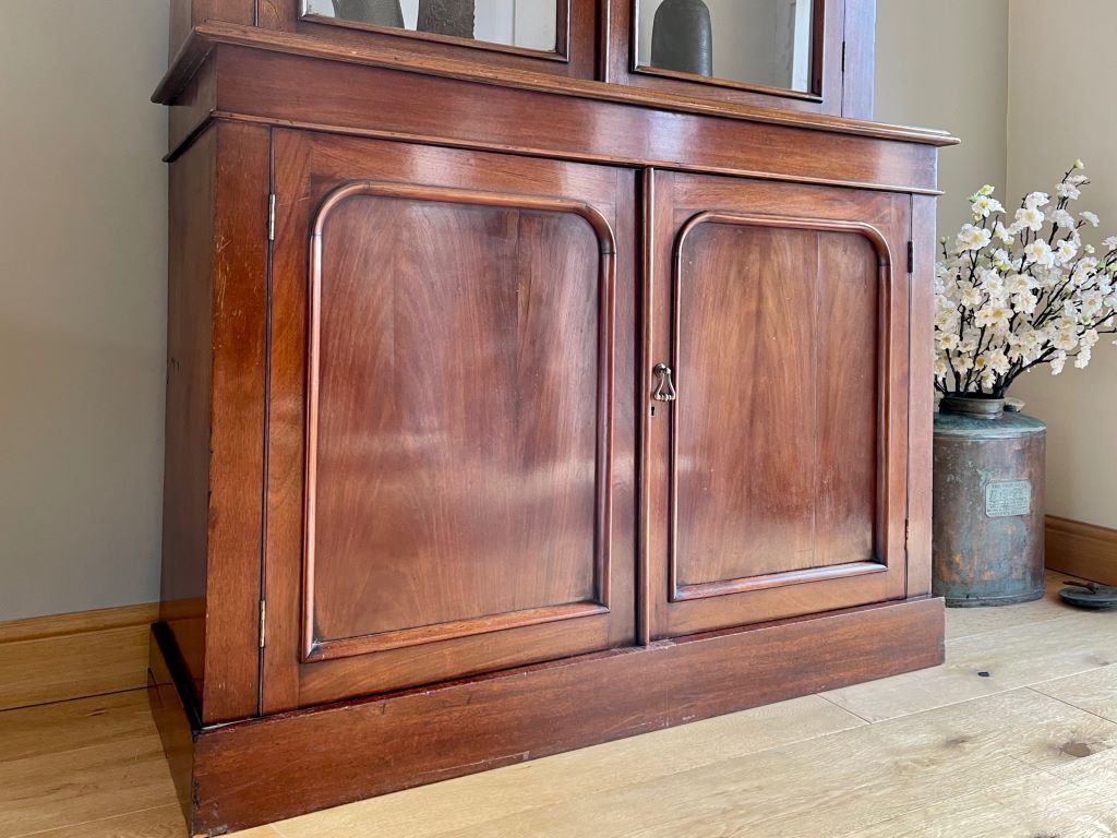 A beautiful late 19th Century Victorian glazed dresser / bookcase in original mahogany finish. It dates from around 1890 to 1900 and has completely original cabinetry, glass, and height adjustable shelves. The dresser is in very good original condition for its age with all joints solid and all four doors opening freely on their original hinges.  We fully cleaned and oiled the original exterior finish then repainted the top internal with Farrow & Ball Wevet colour paint. This has given the piece the perfect mix of antique, rustic and contemporary. It is very stylish, subtle in design and very flexible in the colours – to match a vast array of room palletes.