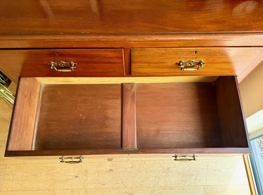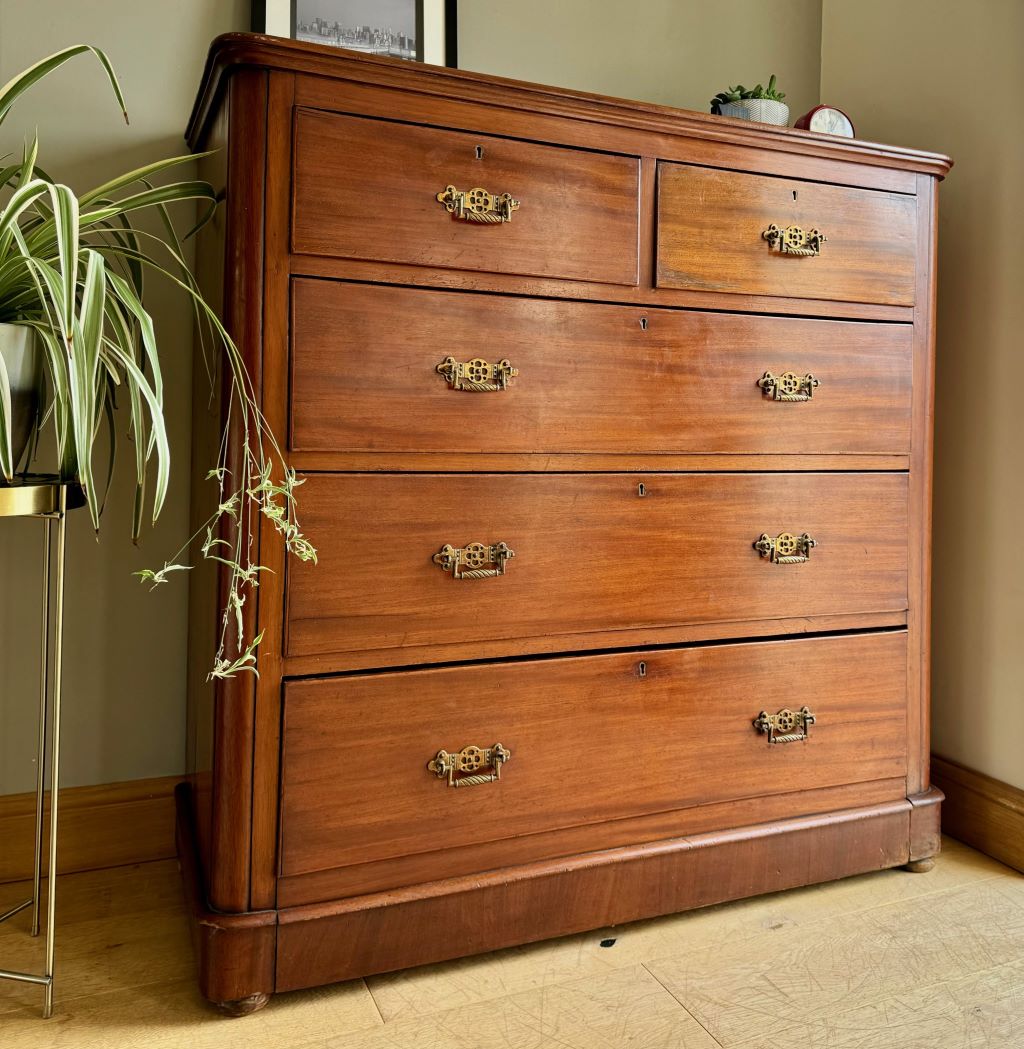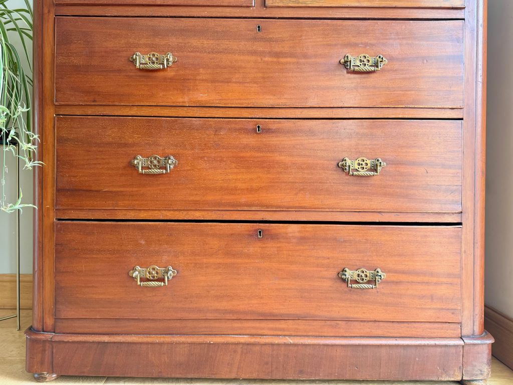 A beautiful large chest of graduated drawers in stunning original mahogany. The drawers are very much of the Arts and Crafts movement in the UK and they date to around 1895-1905. The drawers are presented in a beautifully coloured and aged mahogany with all of the original brass handles. All drawers are clean internally with all of their original drawer bottoms. With so many deep and beautiful drawers the chest offers so much stylish storage for a bedroom, bathroom, hallway etc. We adore these drawers for their classically beautiful lines and their age.