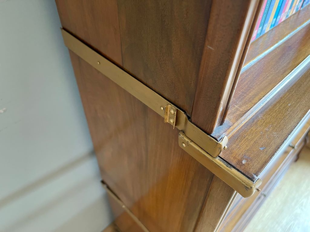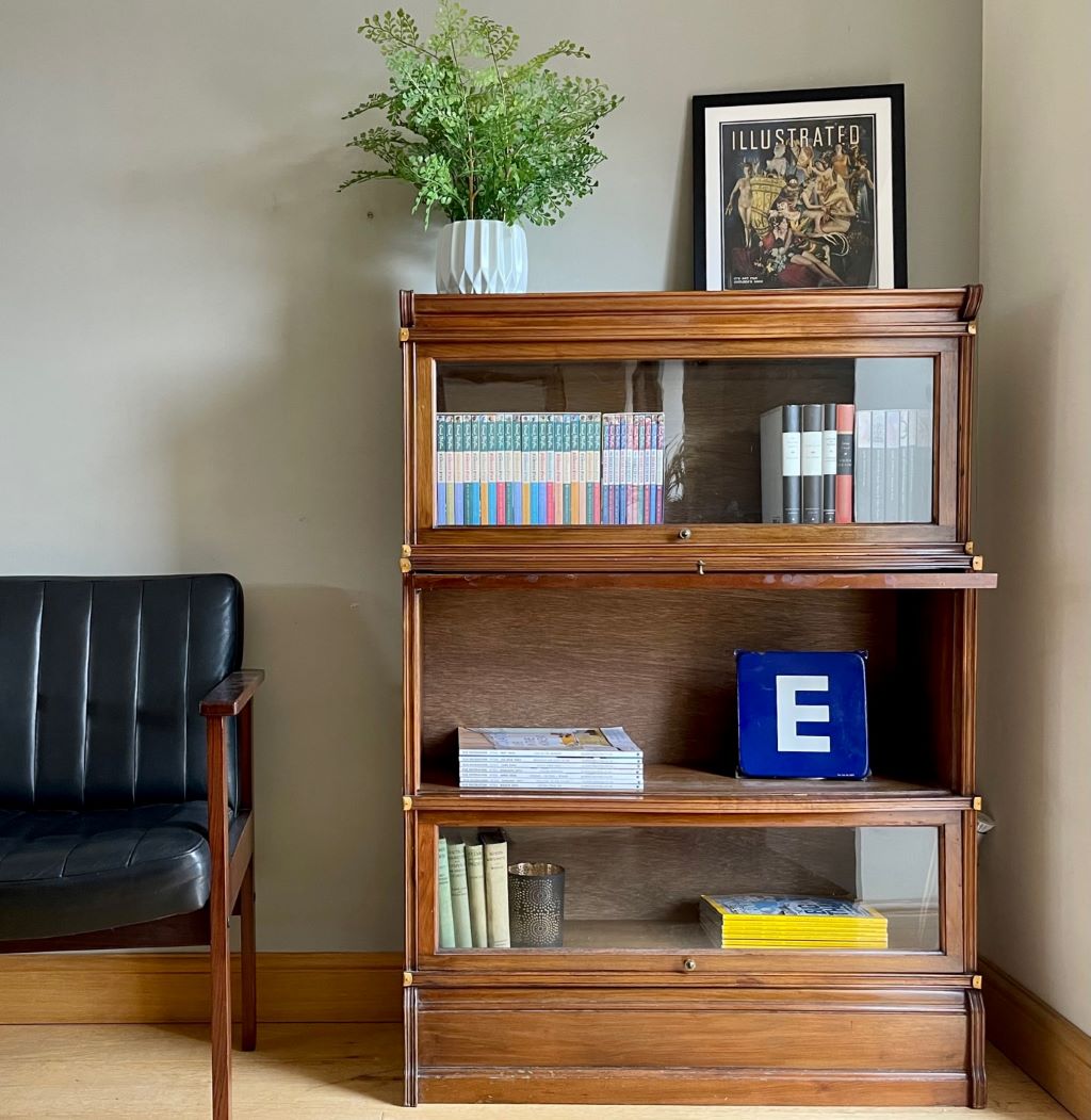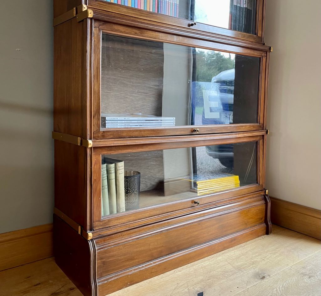 A beautiful early 20th Century stacking bookcase in very good order indeed. The piece offers very stylish storage in its three glazed sections. The mahogany construction has aged perfectly to give a stunning colour with outstanding grain. All of the glass is original, as is the up and over door opening and closing mechanisms. The bookcase splits in to 4 sections for ease of transportation and moving to the room of your choice.