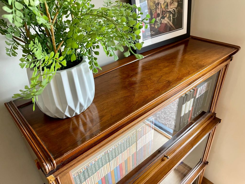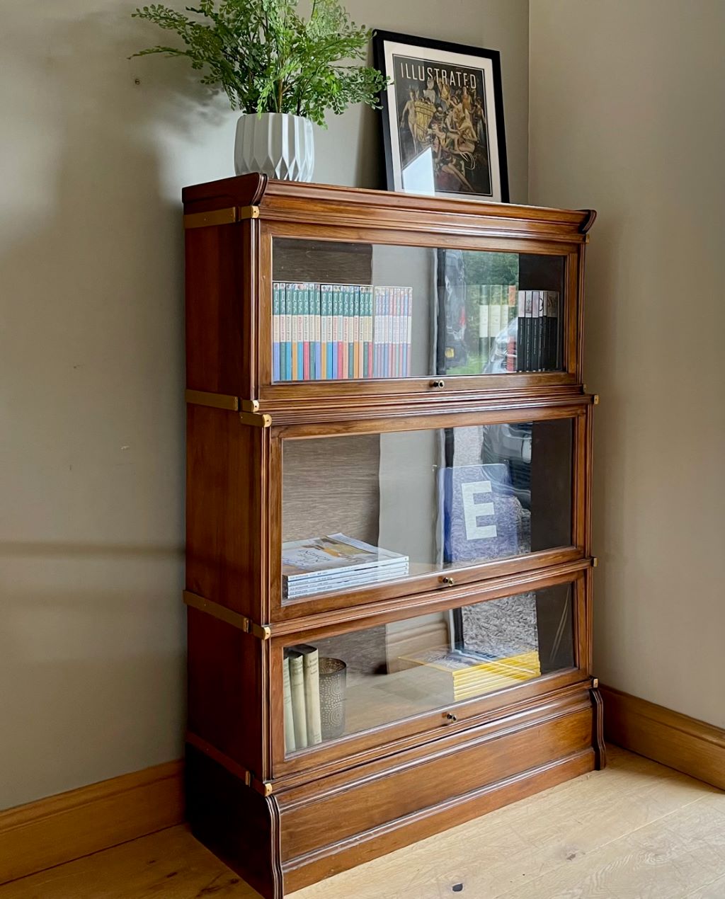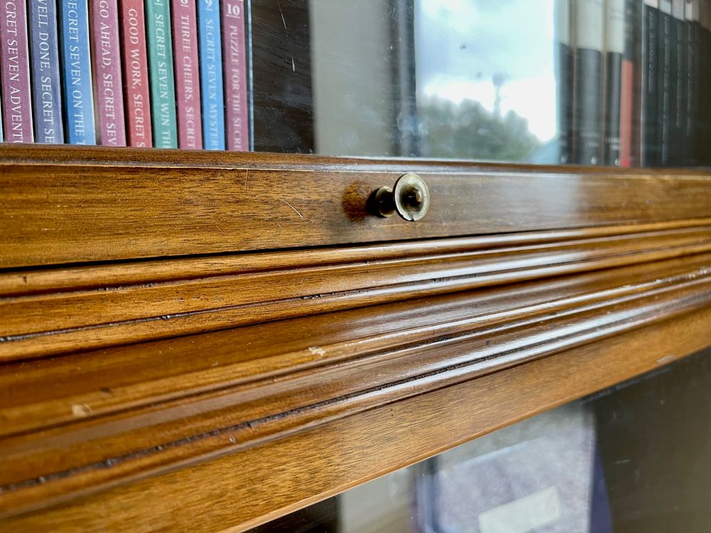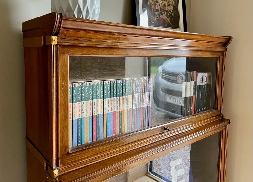 A beautiful early 20th Century stacking bookcase in very good order indeed. The piece offers very stylish storage in its three glazed sections. The mahogany construction has aged perfectly to give a stunning colour with outstanding grain. All of the glass is original, as is the up and over door opening and closing mechanisms. The bookcase splits in to 4 sections for ease of transportation and moving to the room of your choice.