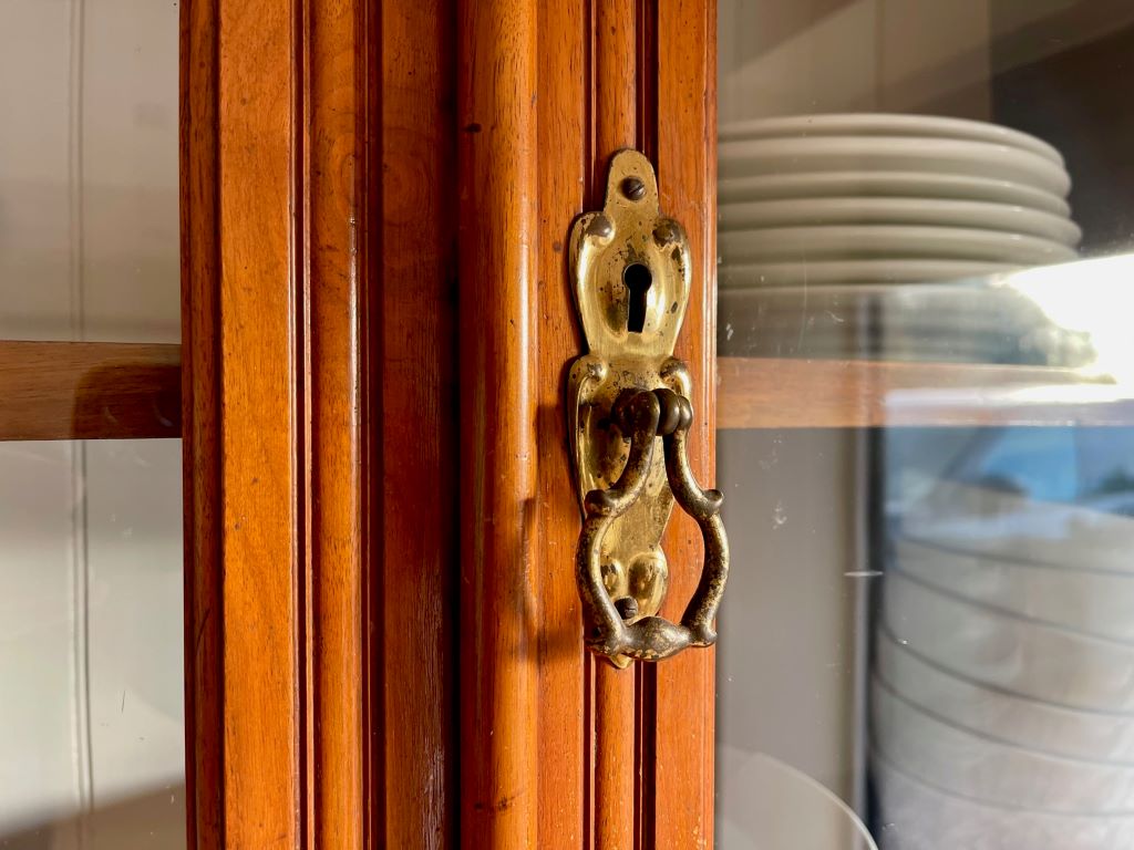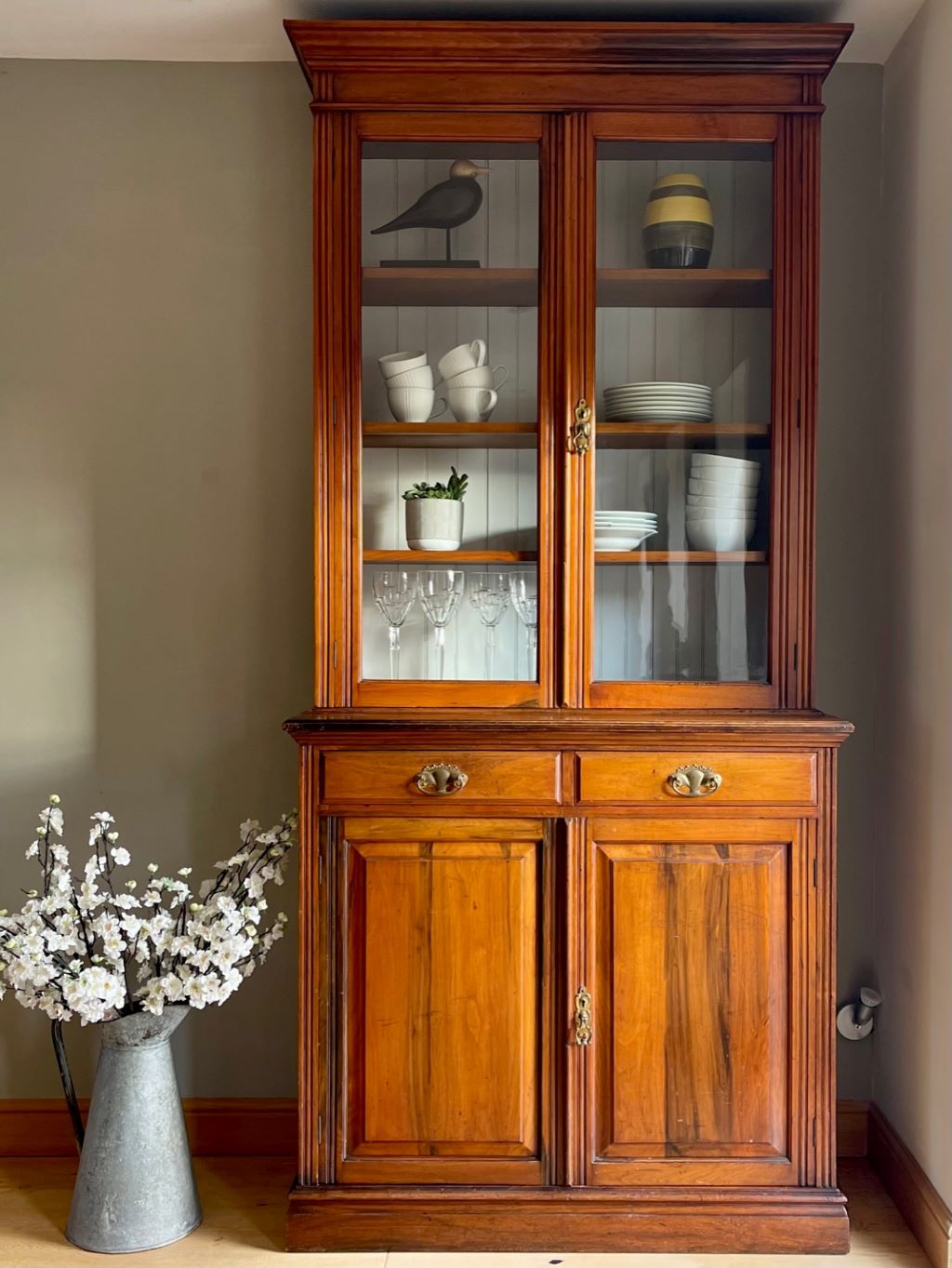 A very stylish early 20th Century Edwardian glazed dresser / bookcase in original oak walnut. It dates from around 1900 to 1920 and has original cabinetry, glass, handles,  and internal bolts. We fully cleaned and gently restored the whole exterior then repainted the top internal section with Farrow & Ball Wevet colour paint. This has given the piece the mix of antique, rustic and contemporary. It is very stylish, subtle in design and very flexible in the colours – to match a vast array of room palletes. The colour is superb having aged beautifully over the last 100 years+. There will be cosmetic marks on the piece, please check all photographs and just ask if you have any further questions over the condition.