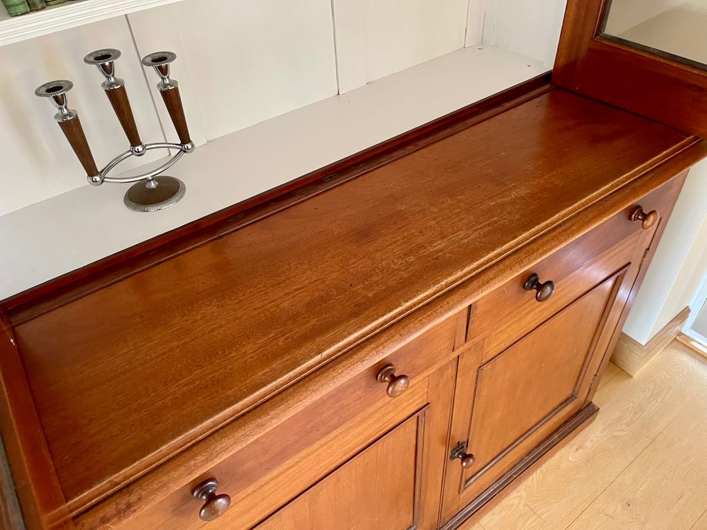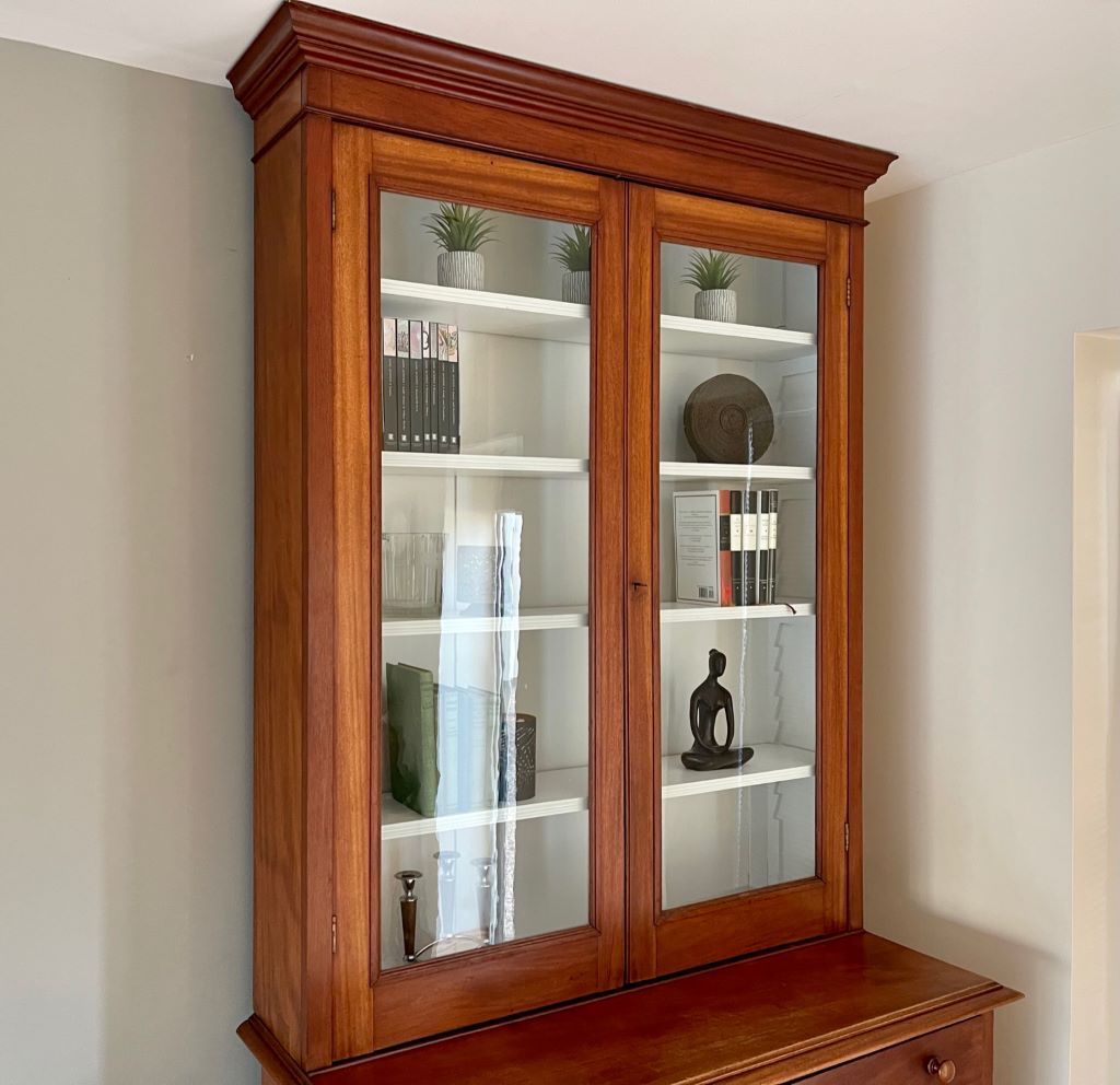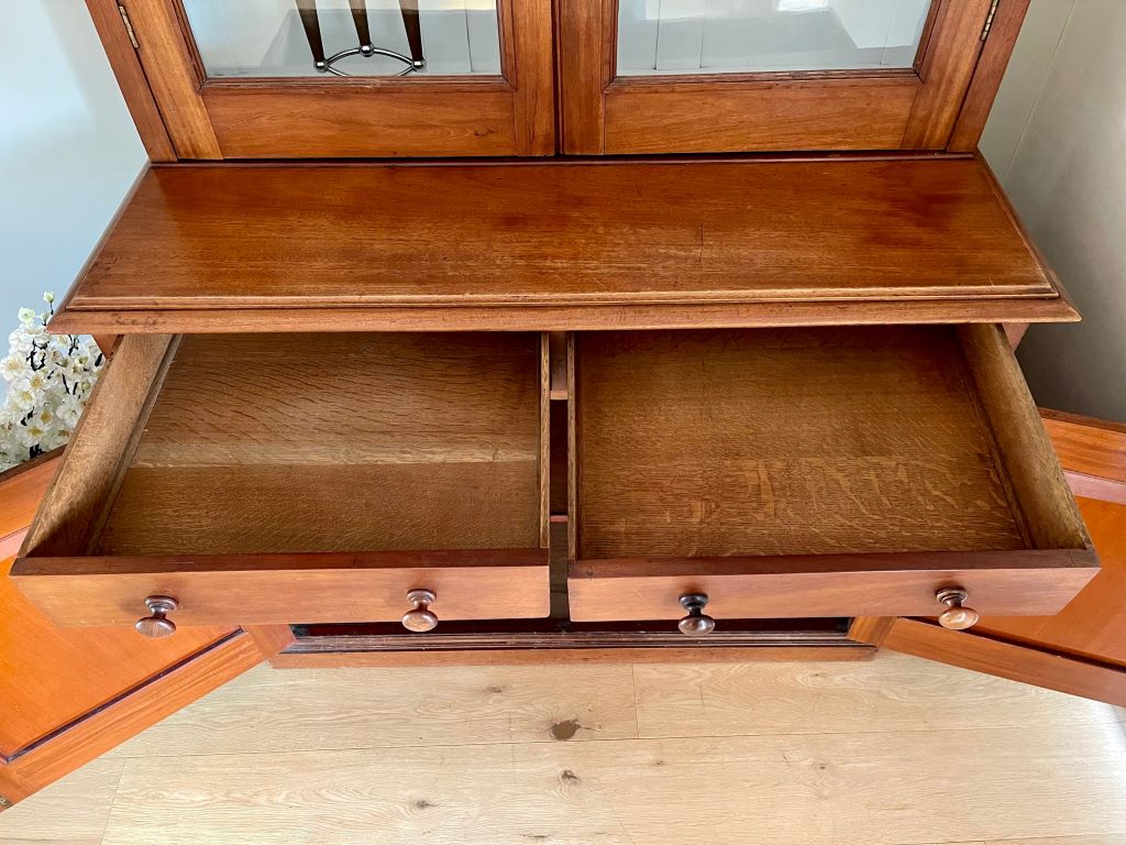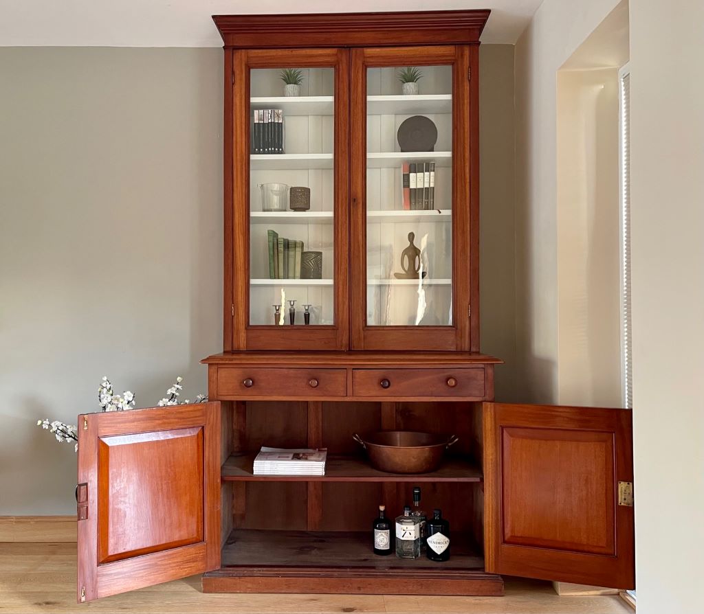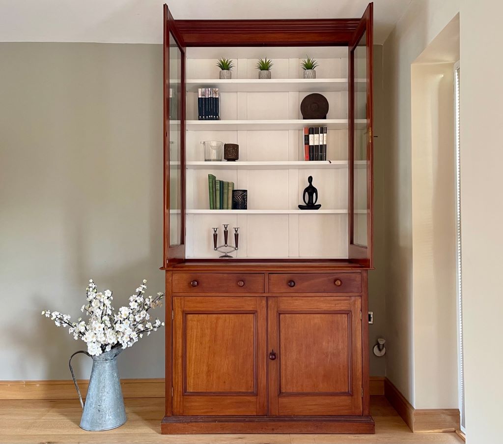 A very stylish late 19th Century Victorian glazed dresser / bookcase in original mahogany finish. It dates from around 1880 to 1900 and has original cabinetry, glass, wooden handles,  lock and key. This came from a private Client home in Amersham, Buckinghamshire where it lived form new, owned by the same family in the same house. We fully cleaned the whole exterior then repainted the top internal section with Farrow & Ball Wevet colour paint. This has given the piece the mix of antique, rustic and contemporary. It is very stylish, subtle in design and very flexible in the colours – to match a vast array of room palletes. The colour is superb having aged beautifully over the last 120 years+. There is one small old repair to the left hand side of the top section. Please see the photograph. Clearly a professional repair (approx 5cm x 4cm) but there is colour variation to the wood.