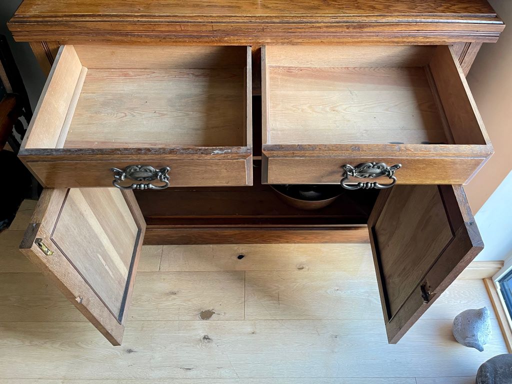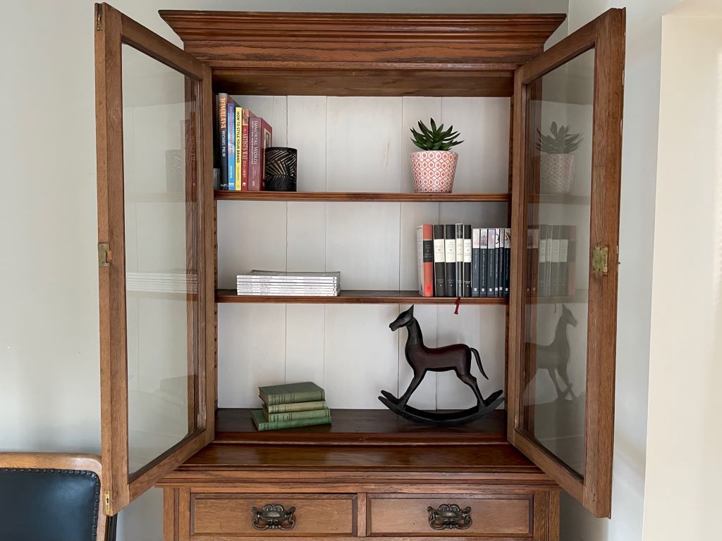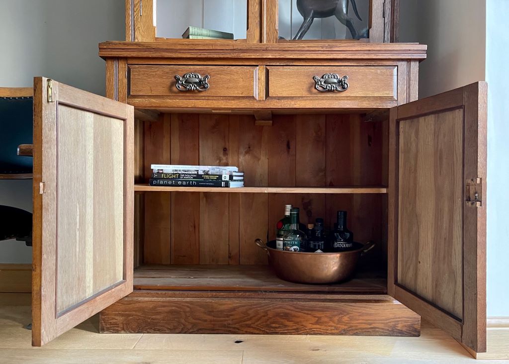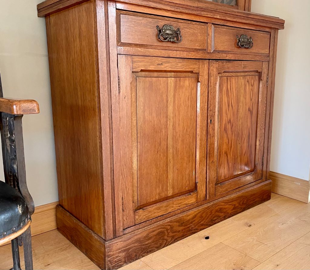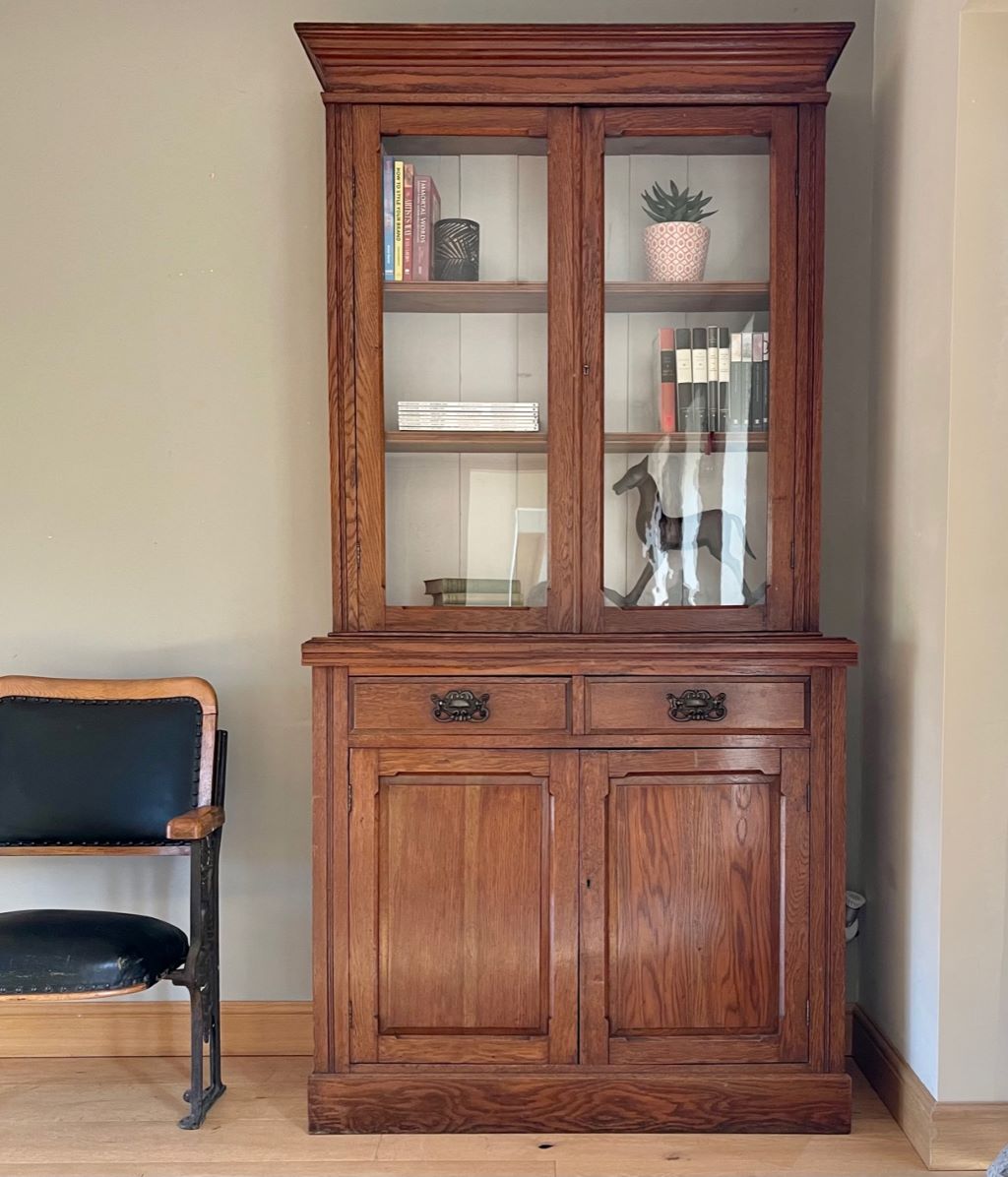 A very stylish late 19th Century Victorian glazed dresser / bookcase in original oak finish. It dates from around 1880 to 1900 and has original cabinetry, glass, beautifully ornate handles,  lock and key. We fully cleaned and gently restored the whole exterior then repainted the top internal section with Farrow & Ball Wevet colour paint. This has given the piece the mix of antique, rustic and contemporary. It is very stylish, subtle in design and very flexible in the colours – to match a vast array of room palletes. The colour is superb having aged beautifully over the last 120 years+.