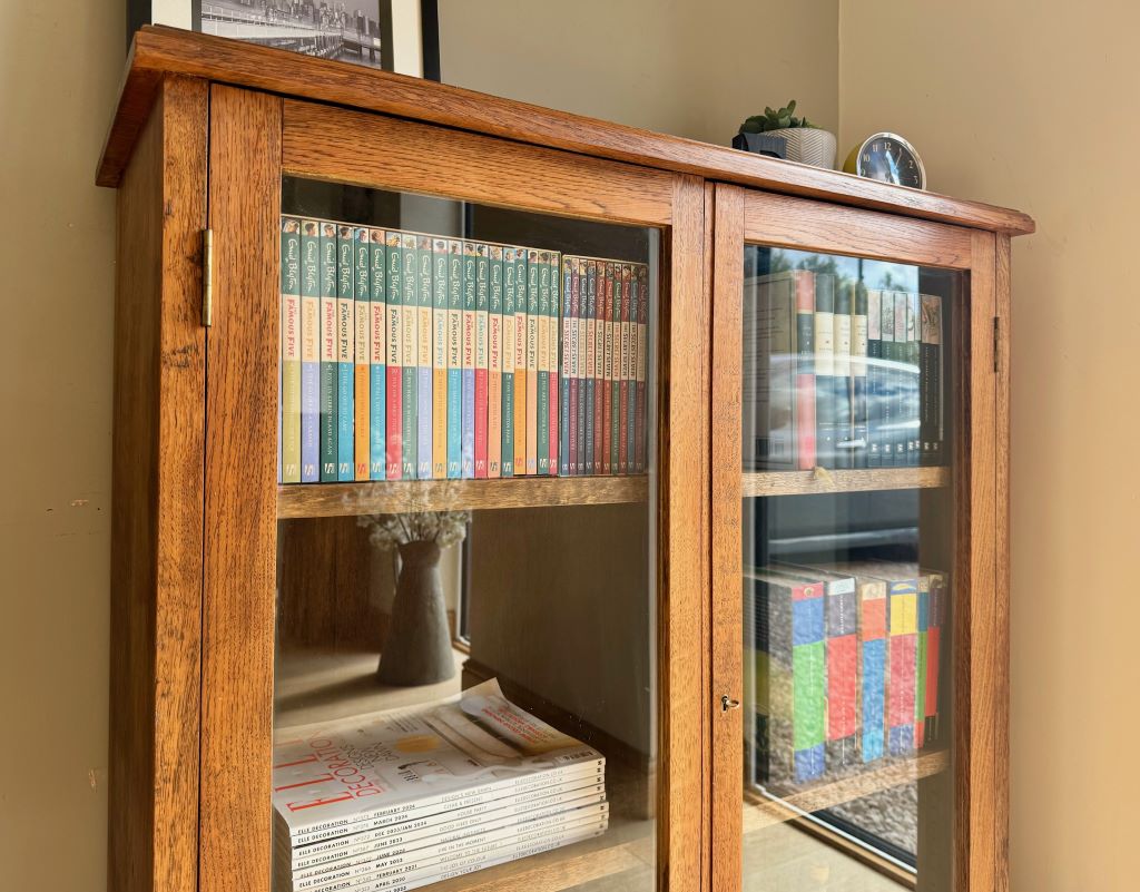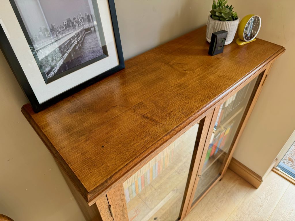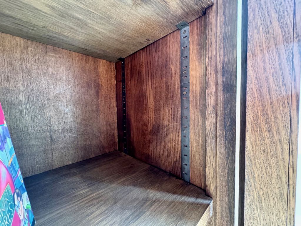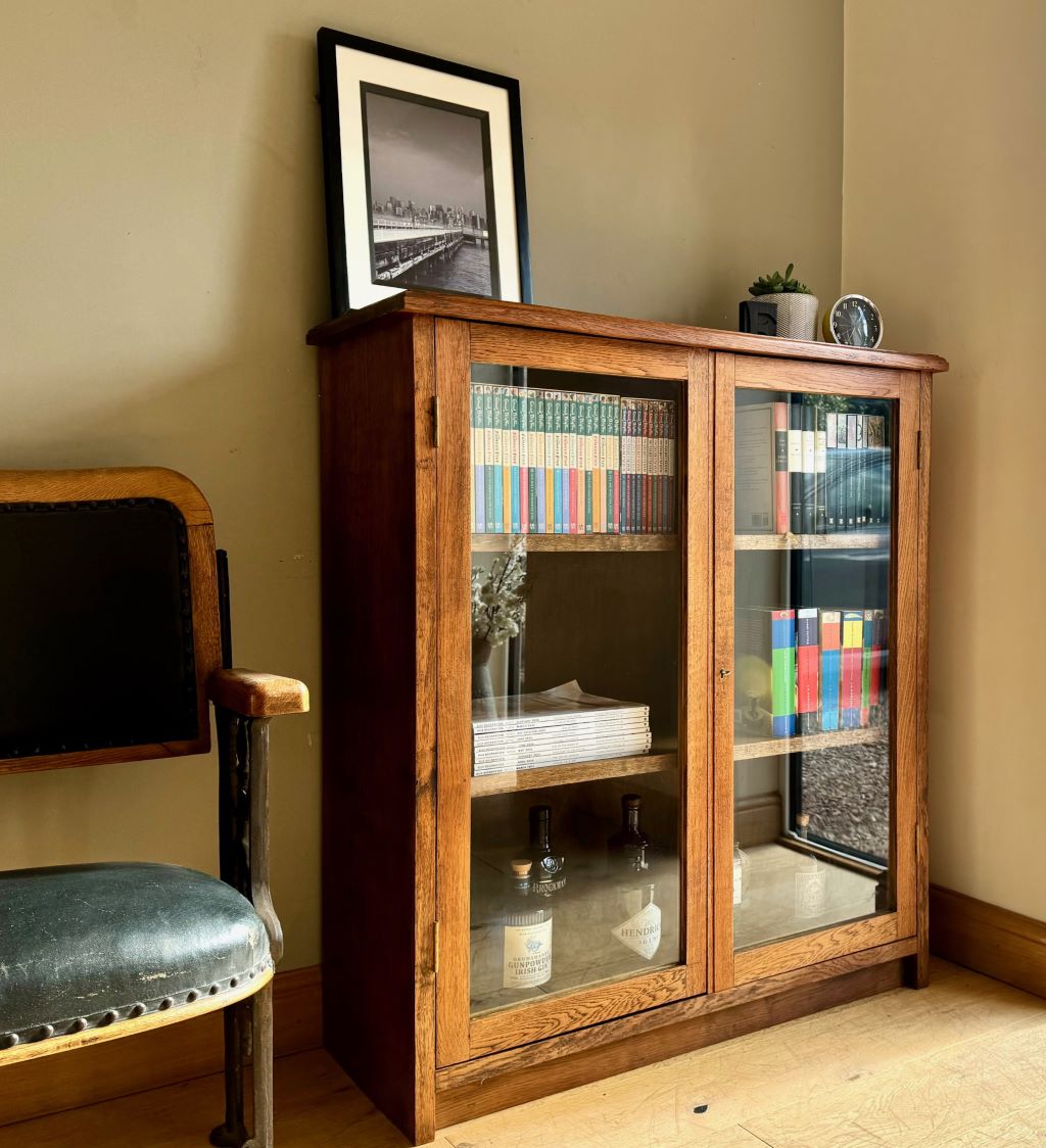 A gorgeous solid oak bookcase dating from around the 1970’s. It weighs in the region of 50kgs, reflective of the quality and thickness of the solid oak used in its production. Even the shelves are made of thick solid oak. Each shelf is height adjustable via the side support system. Simply move the side supports to the place you want them and reinsert the shelves. We love the clean simple lines and beautiful oak grain; all in a size that makes it easy easy to fit in to almost any room. The bookcase retains its working lock and key.