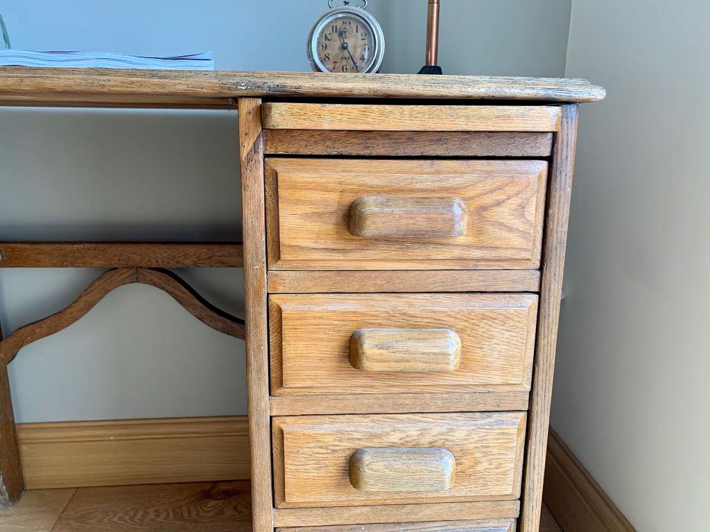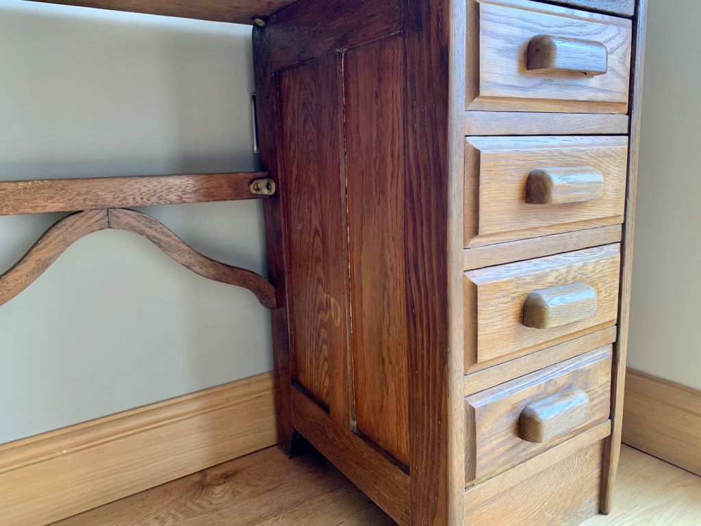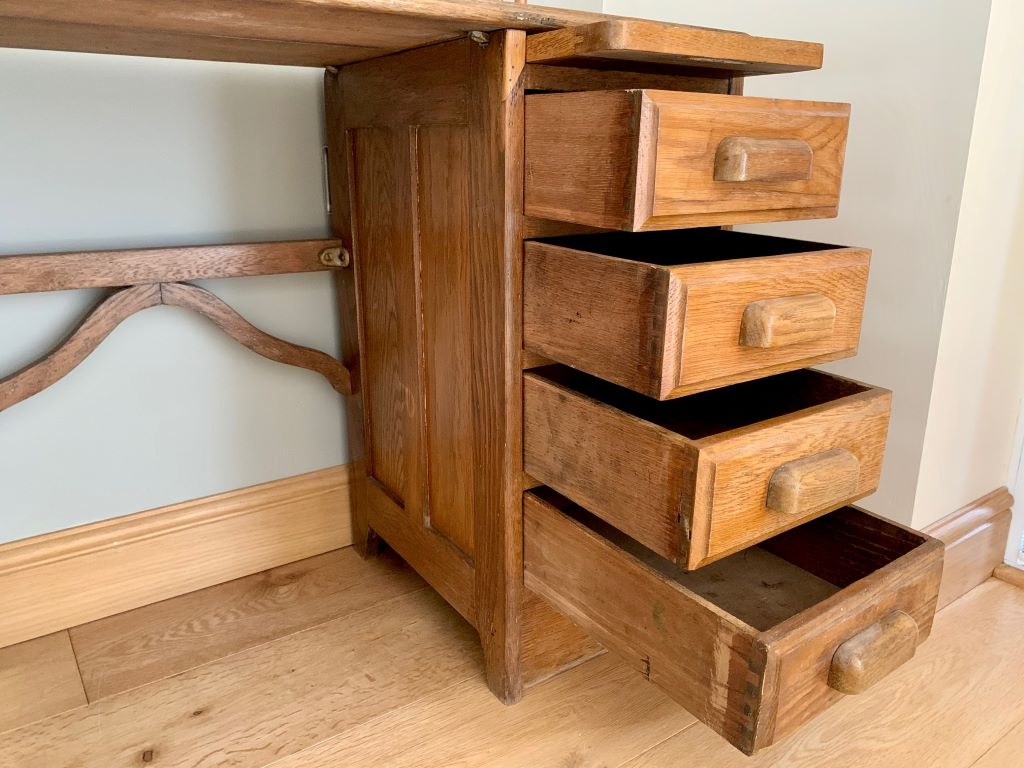 The desk has four free running drawers and a pull out top shelf. To the left is an extendable leaf, should you need it. There are a couple of small repairs to the front upper ‘legs’ of the table. Repaired in oak some time ago. It is an unusual design and will certainly add some real style to a room.