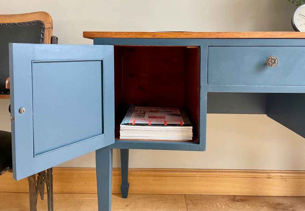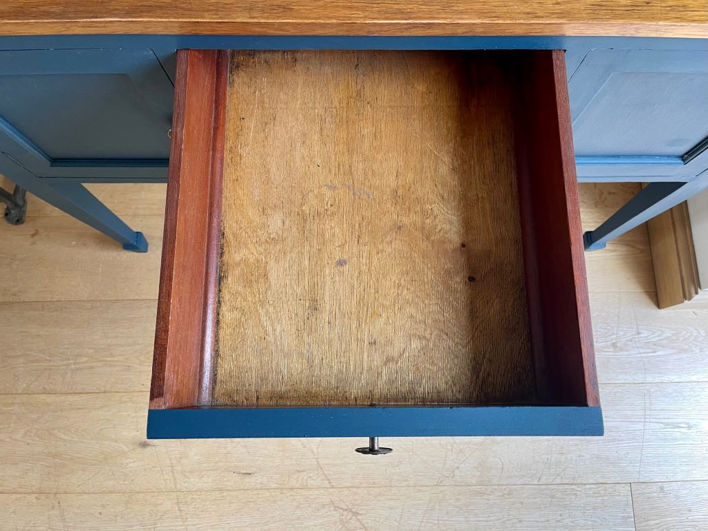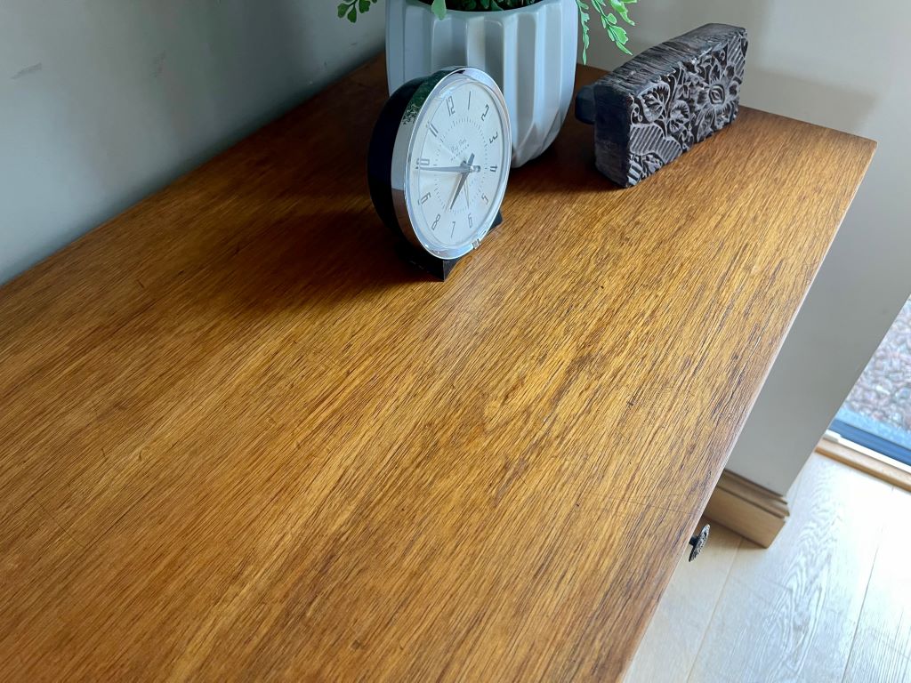 We think it now offers a very contemporary and useful console table made from solid wood and offering many more years of use. Reclaimed and refinished furniture is so much better for the planet too!