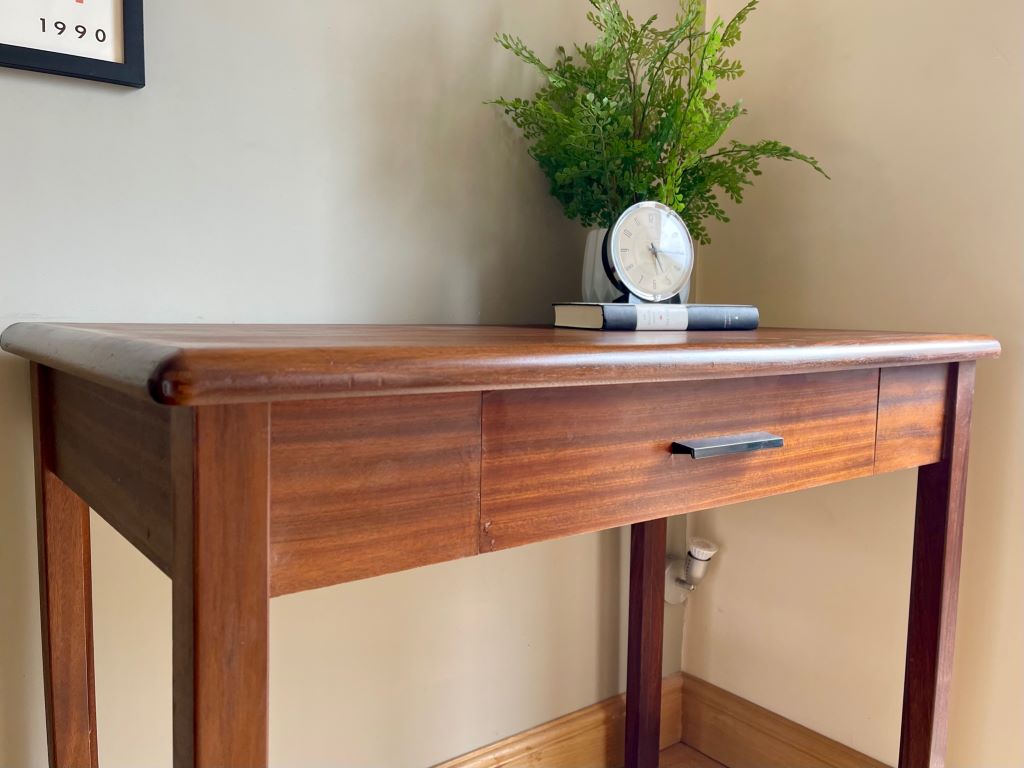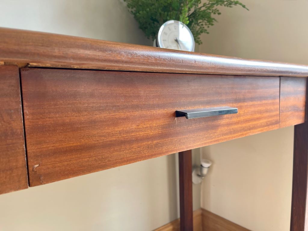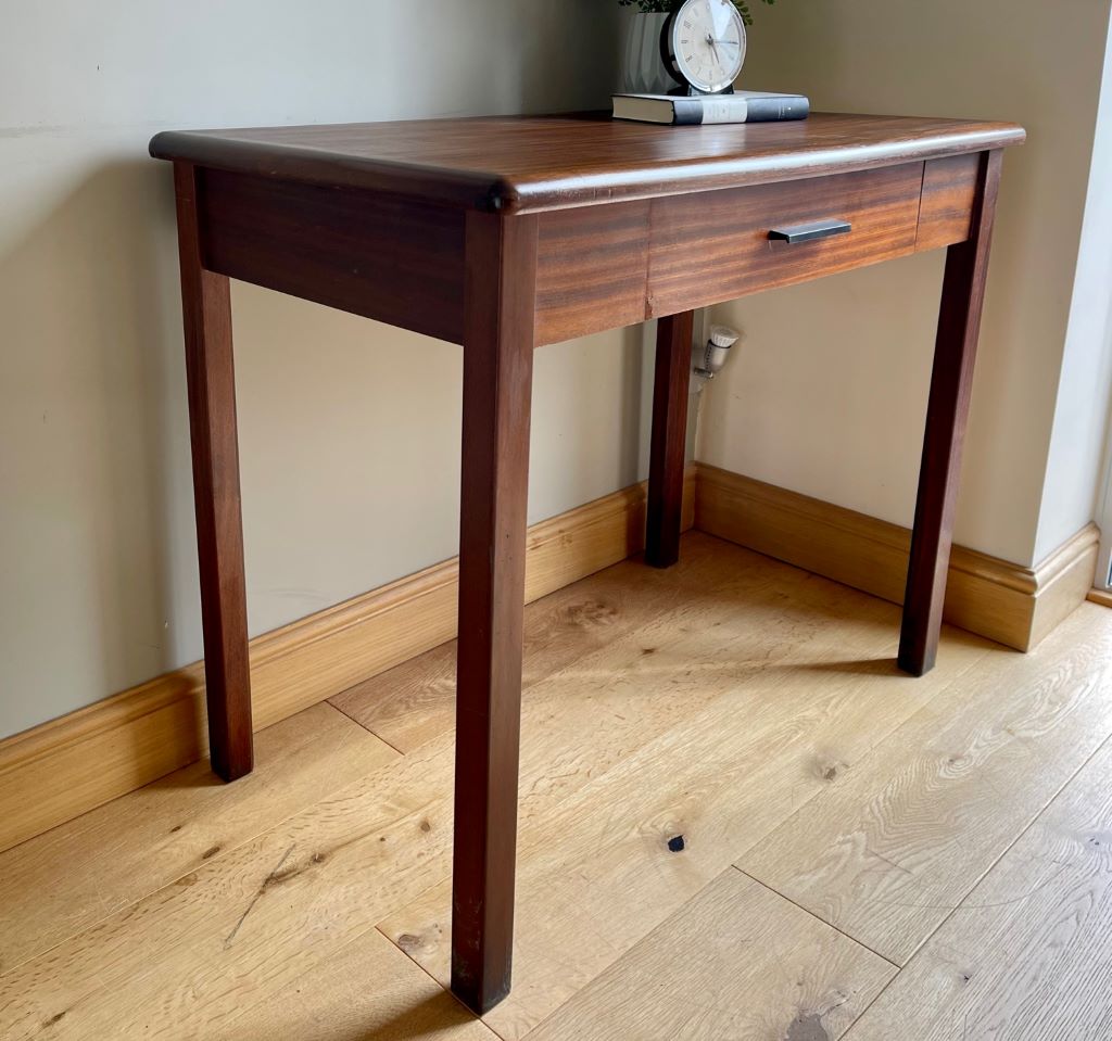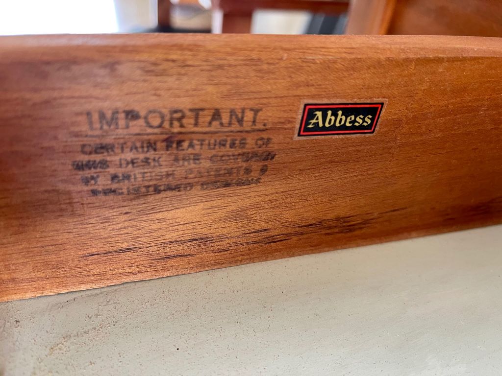 A very cute and stylish desk / table by Abbess. Made from a beautifully rich Walnut and walnut veneer it could be used as a desk, if space is tight, a cute dressing table or hall/ console table. It could equally be a great desk for a child or teen. Made around the late 1960’s to early 1970’s it retains the Abbess label inside the drawer and is stamped to the bottom of the drawer. Superb Retro styling and a great colour. A desk/ table with a difference. There is one very small area of missing/ cracked veneer to the bottom left corner of the drawer. Very small indeed but please see photograph for size.